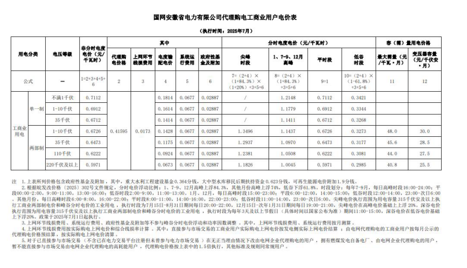 安徽省7月份代理購電工商業(yè)用戶電價表