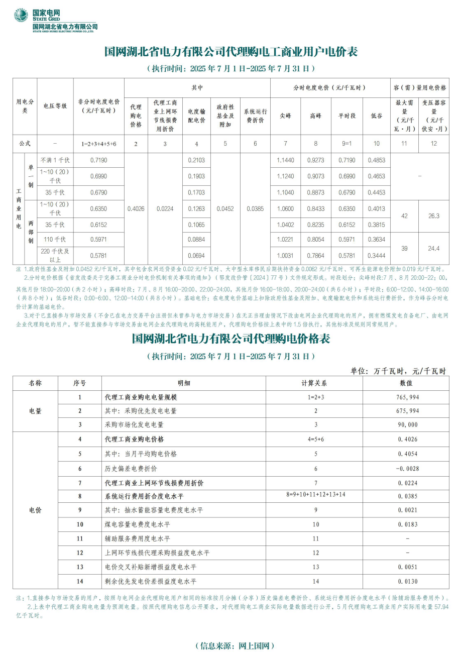 湖北省7月份代理購電工商業(yè)用戶電價表