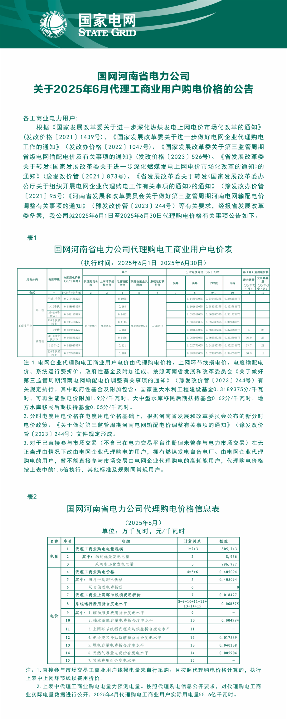 河南省7月份代理購電工商業(yè)用戶電價表