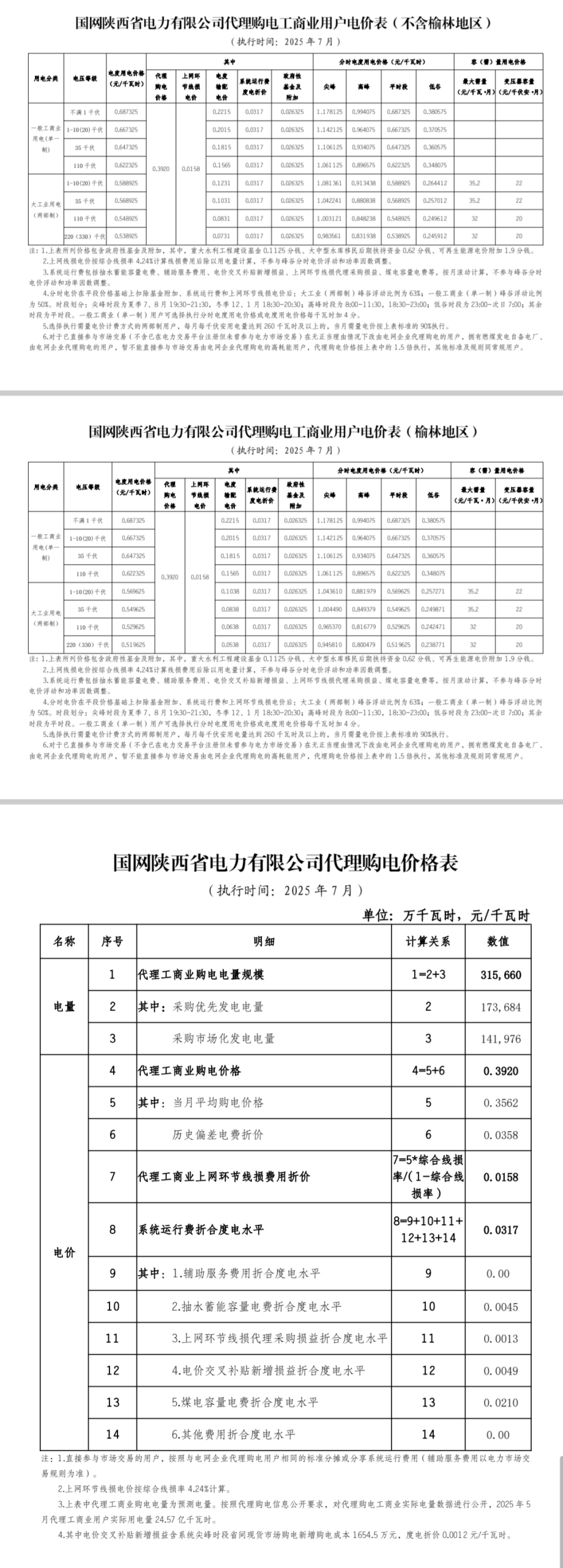 陜西省7月份代理購電工商業(yè)用戶電價表