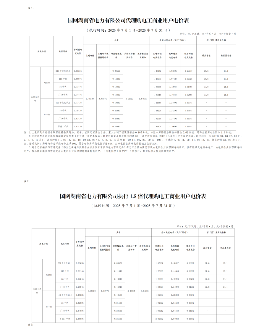 湖南省7月份代理購電工商業(yè)用戶電價表