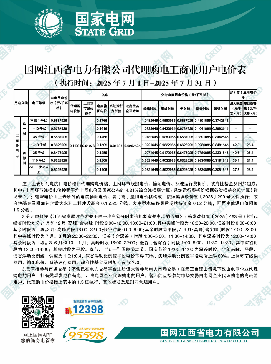江西省7月份代理購電工商業(yè)用戶電價表