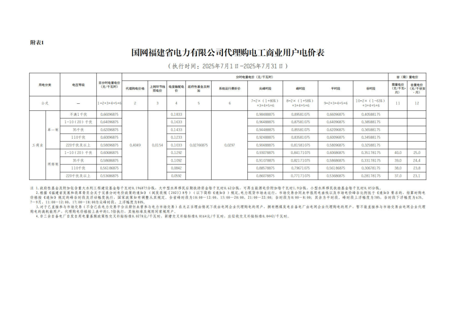 福建省7月份代理購電工商業(yè)用戶電價表