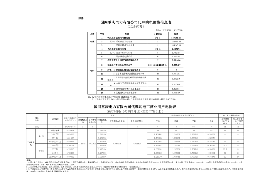 重慶市7月份代理購電工商業(yè)用戶電價表