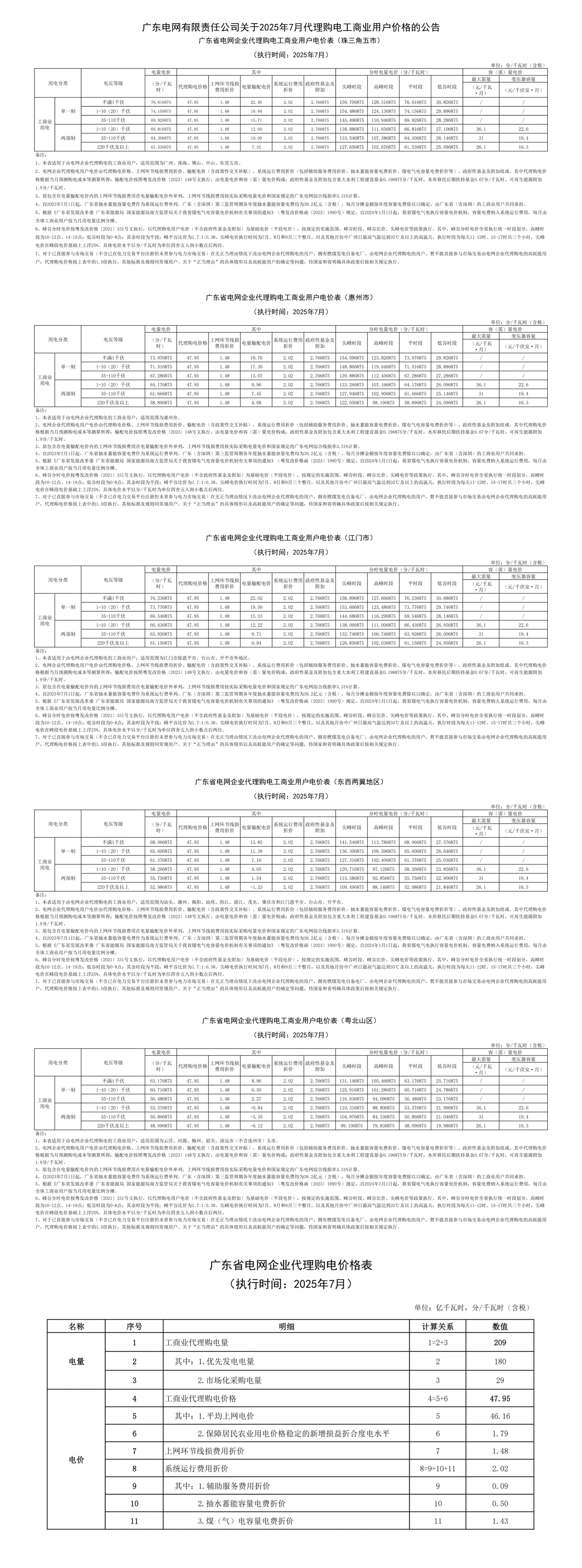 廣東省7月份代理購電工商業(yè)用戶電價表