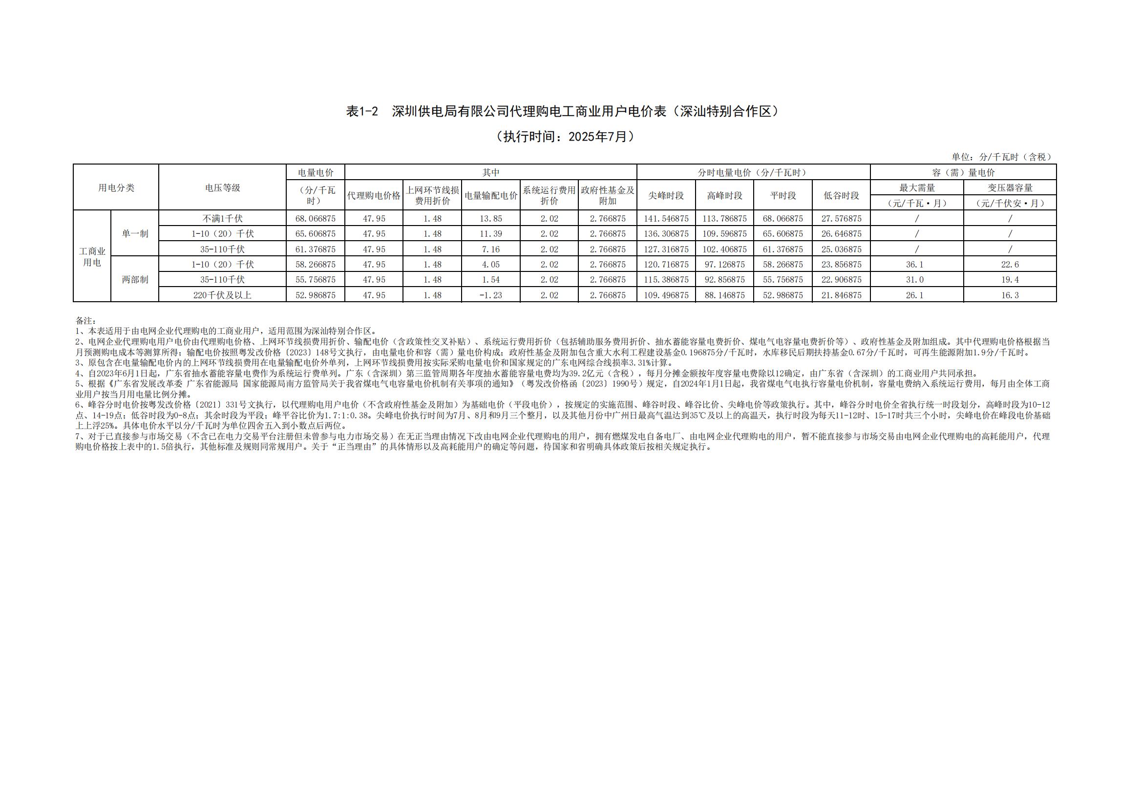 深圳市7月份代理購電工商業(yè)用戶電價表