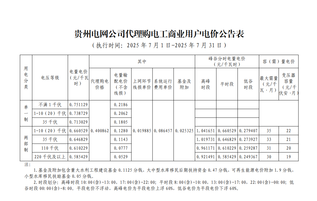 貴州省7月份代理購電工商業(yè)用戶電價表