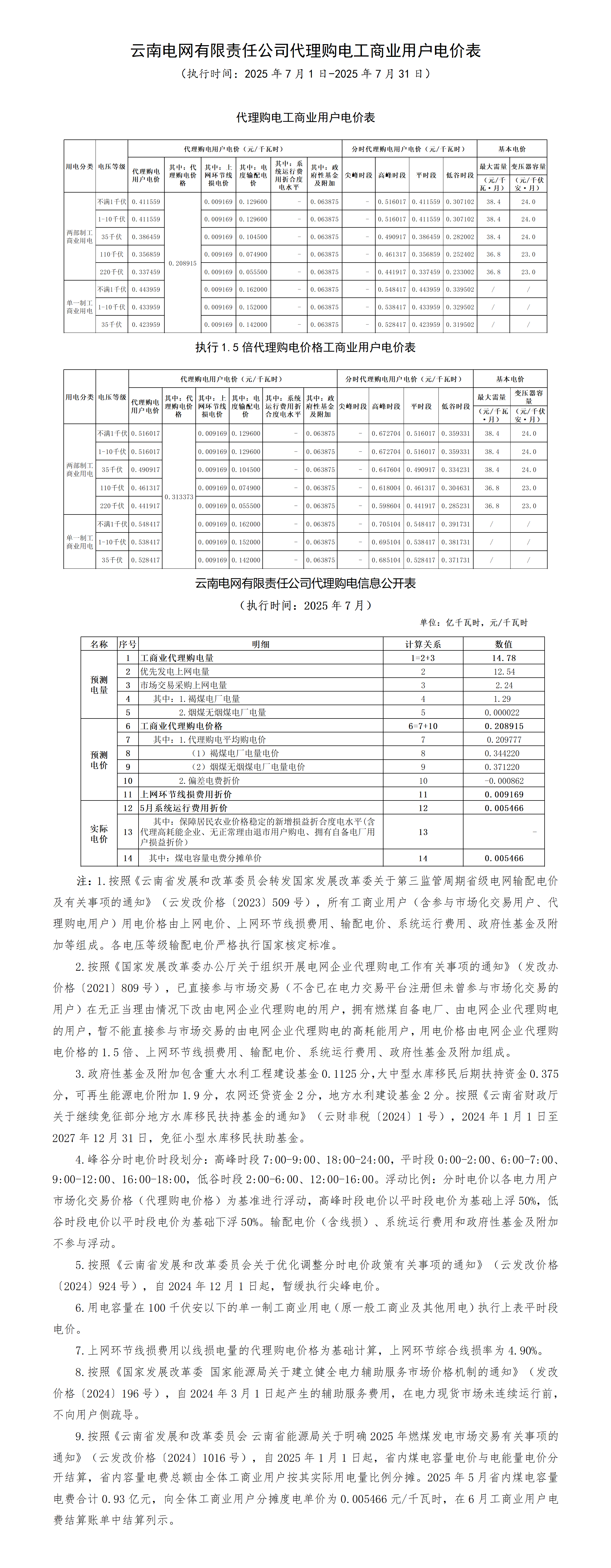 云南省7月份代理購電工商業(yè)用戶電價表
