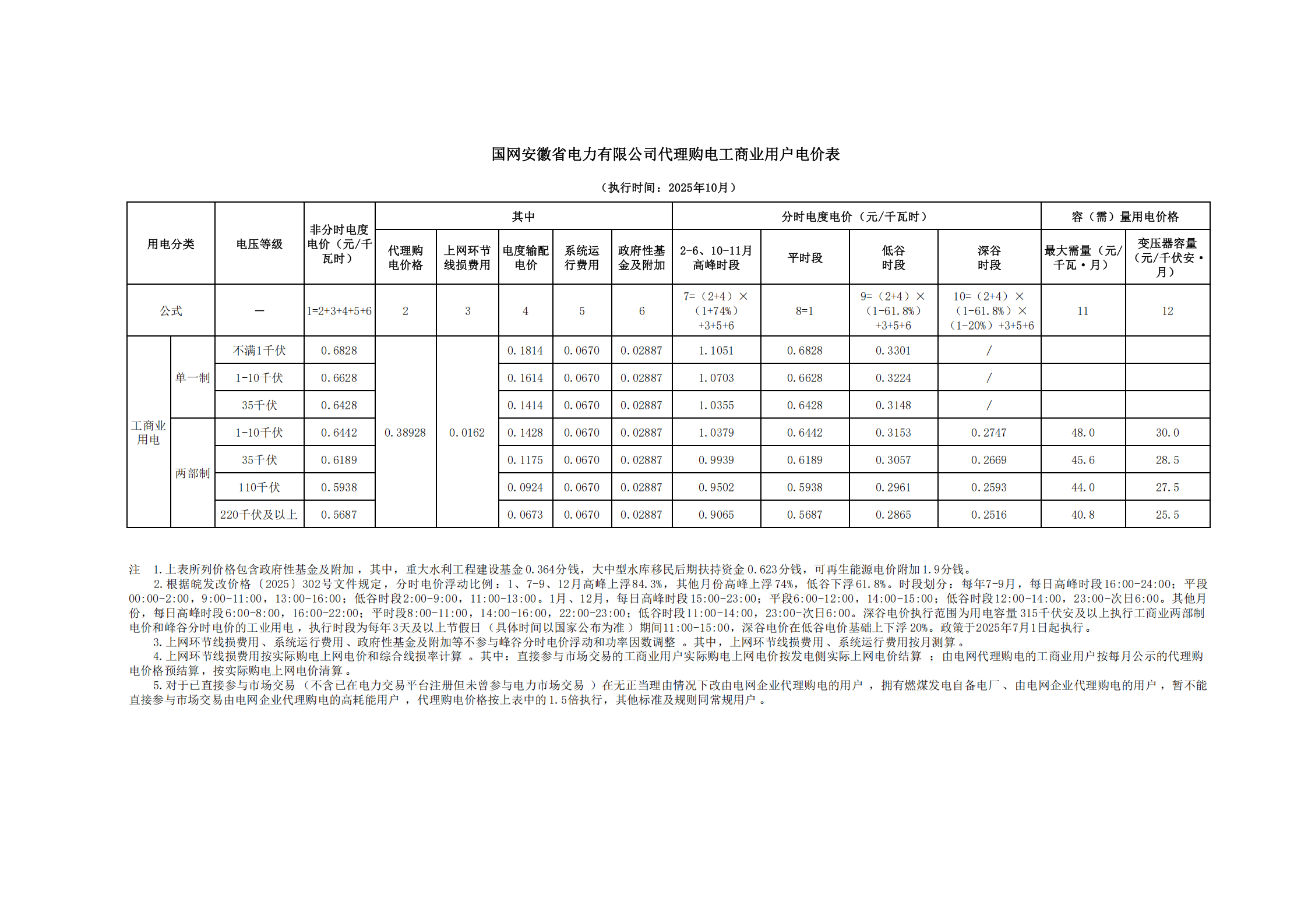 安徽省10月份代理購電工商業(yè)用戶電價(jià)表
