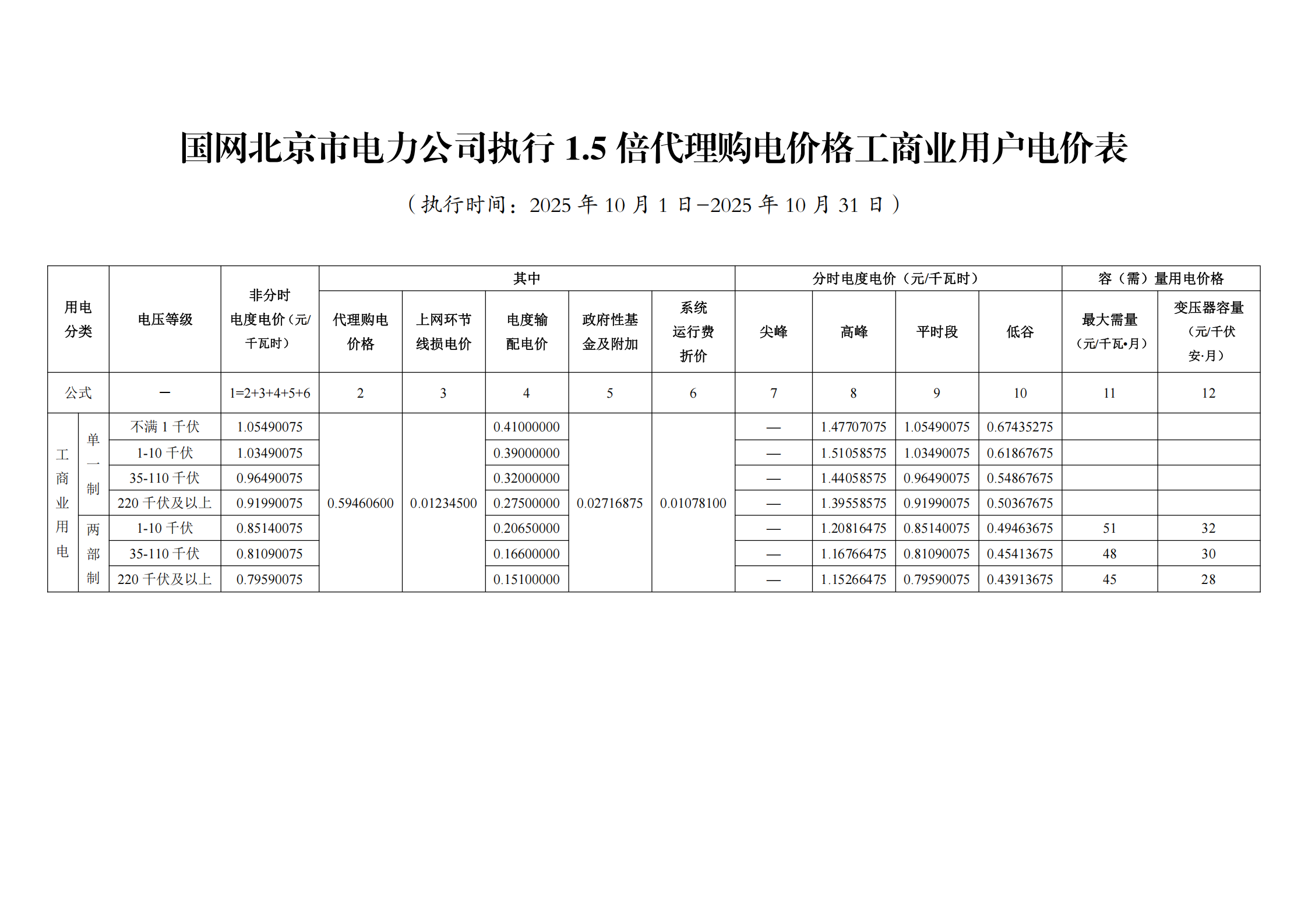 北京10月份代理購電工商業(yè)用戶電價(jià)表