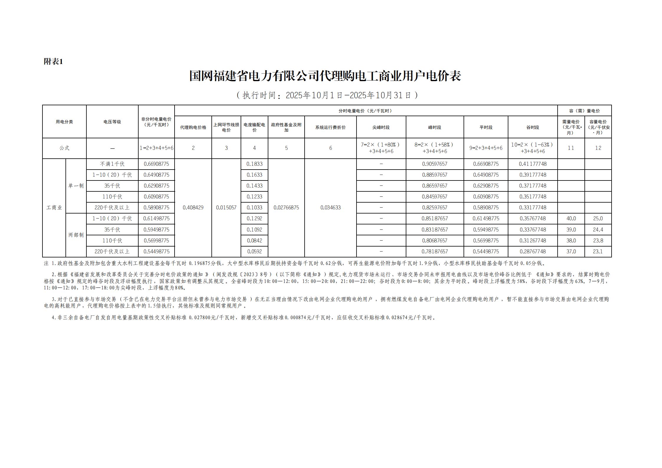福建省10月份代理購電工商業(yè)用戶電價(jià)表