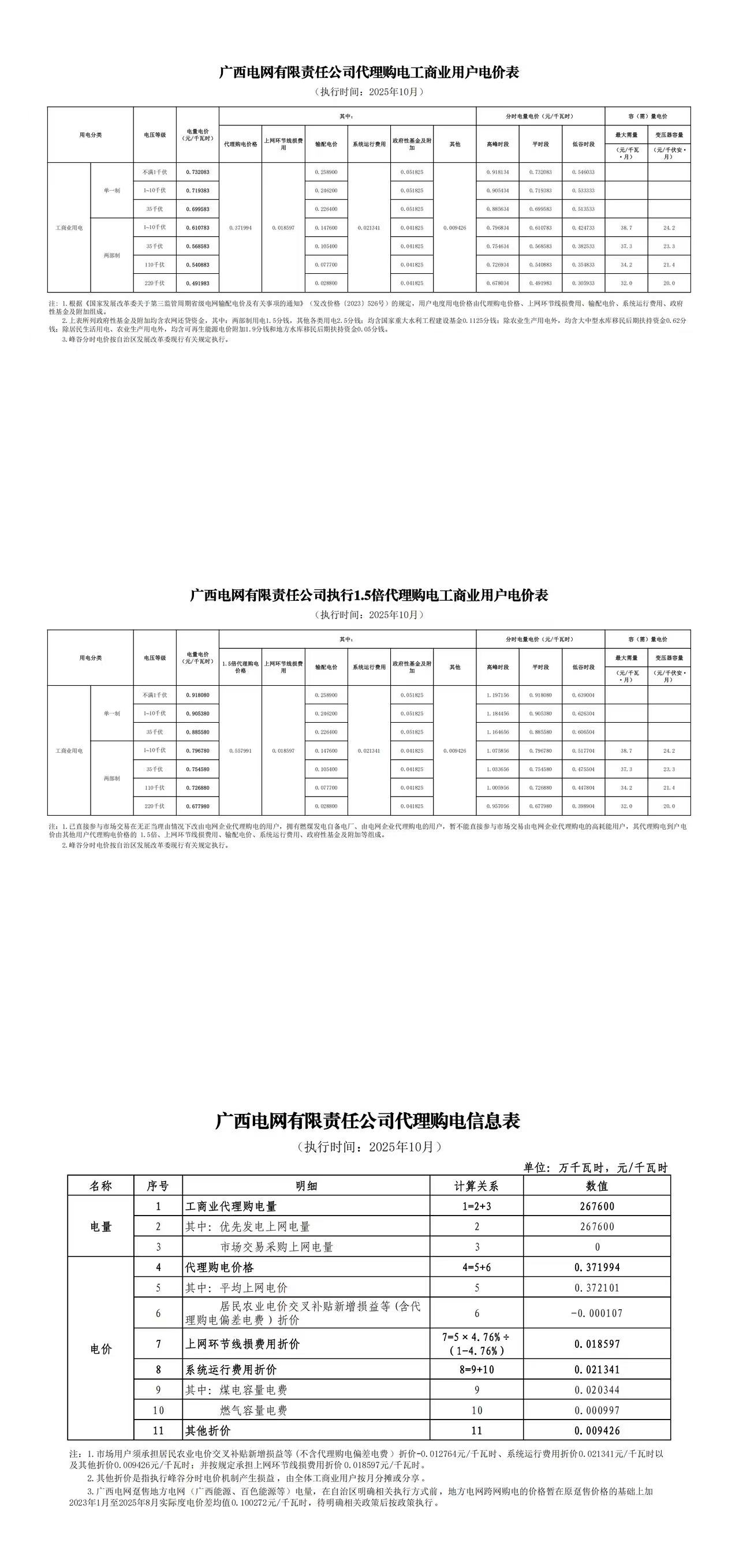廣西省10月份代理購電工商業(yè)用戶電價(jià)表