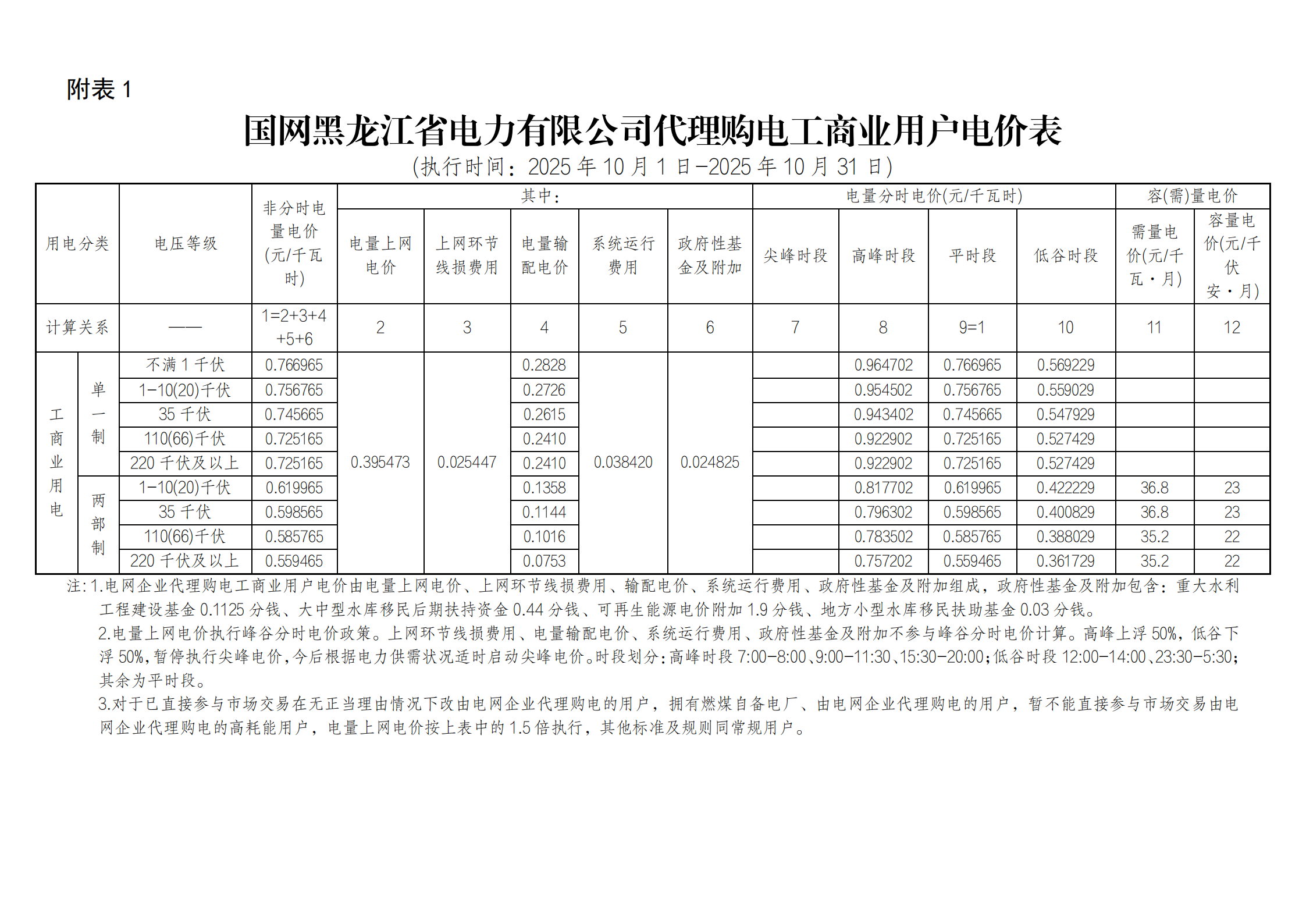 黑龍江省10月份代理購電工商業(yè)用戶電價(jià)表