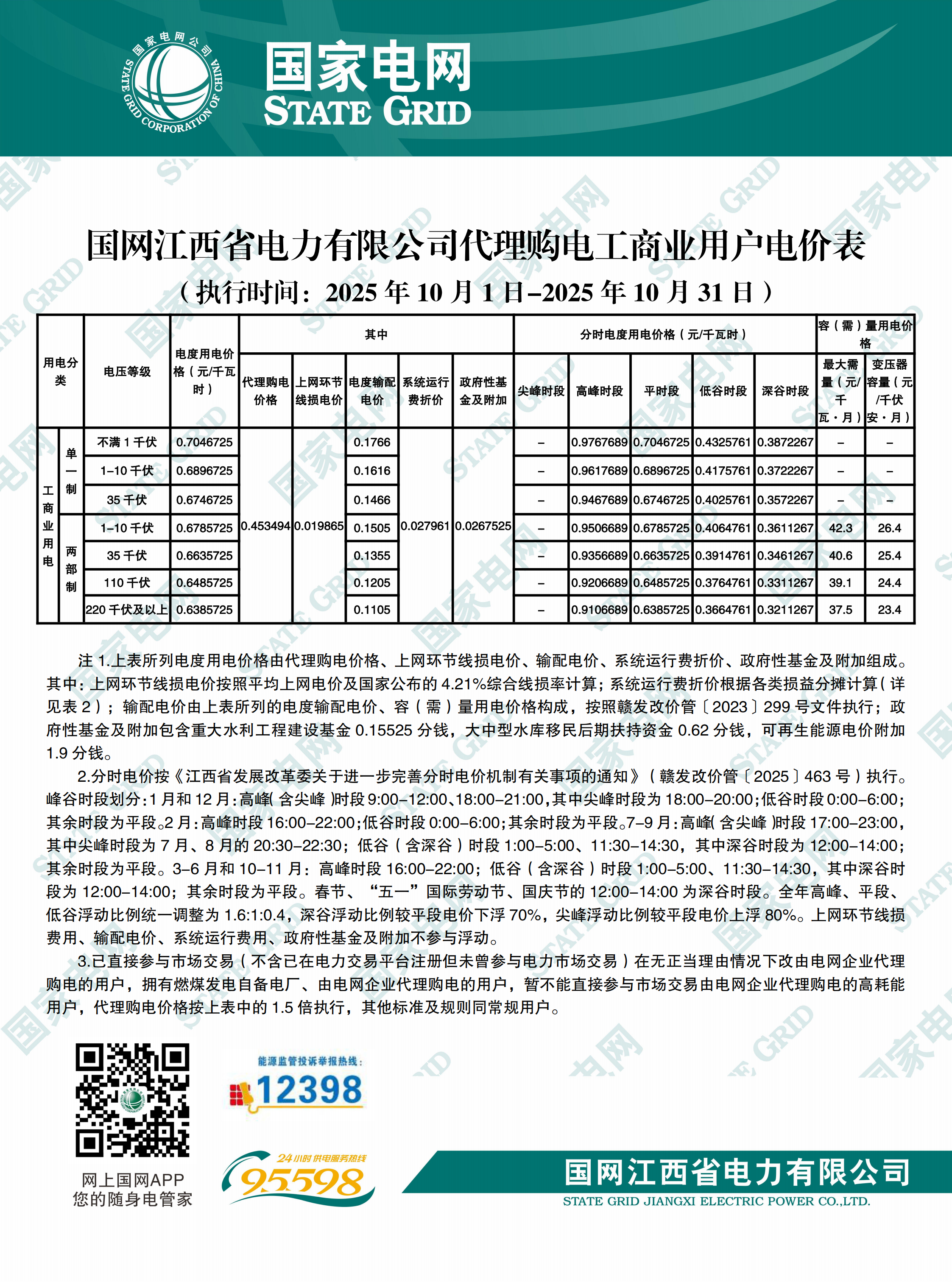 江西省10月份代理購電工商業(yè)用戶電價(jià)表
