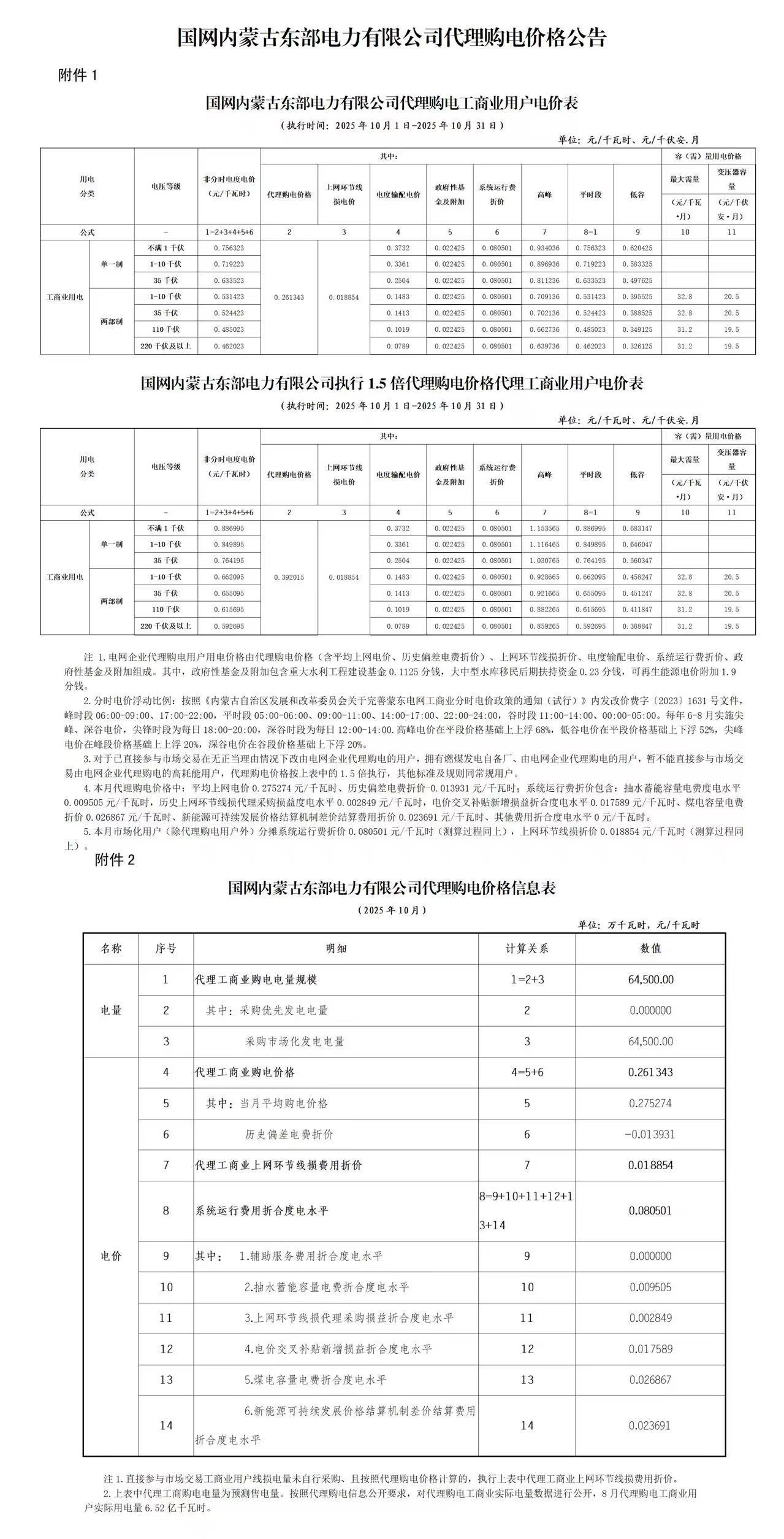 內(nèi)蒙古省10月份代理購電工商業(yè)用戶電價(jià)表