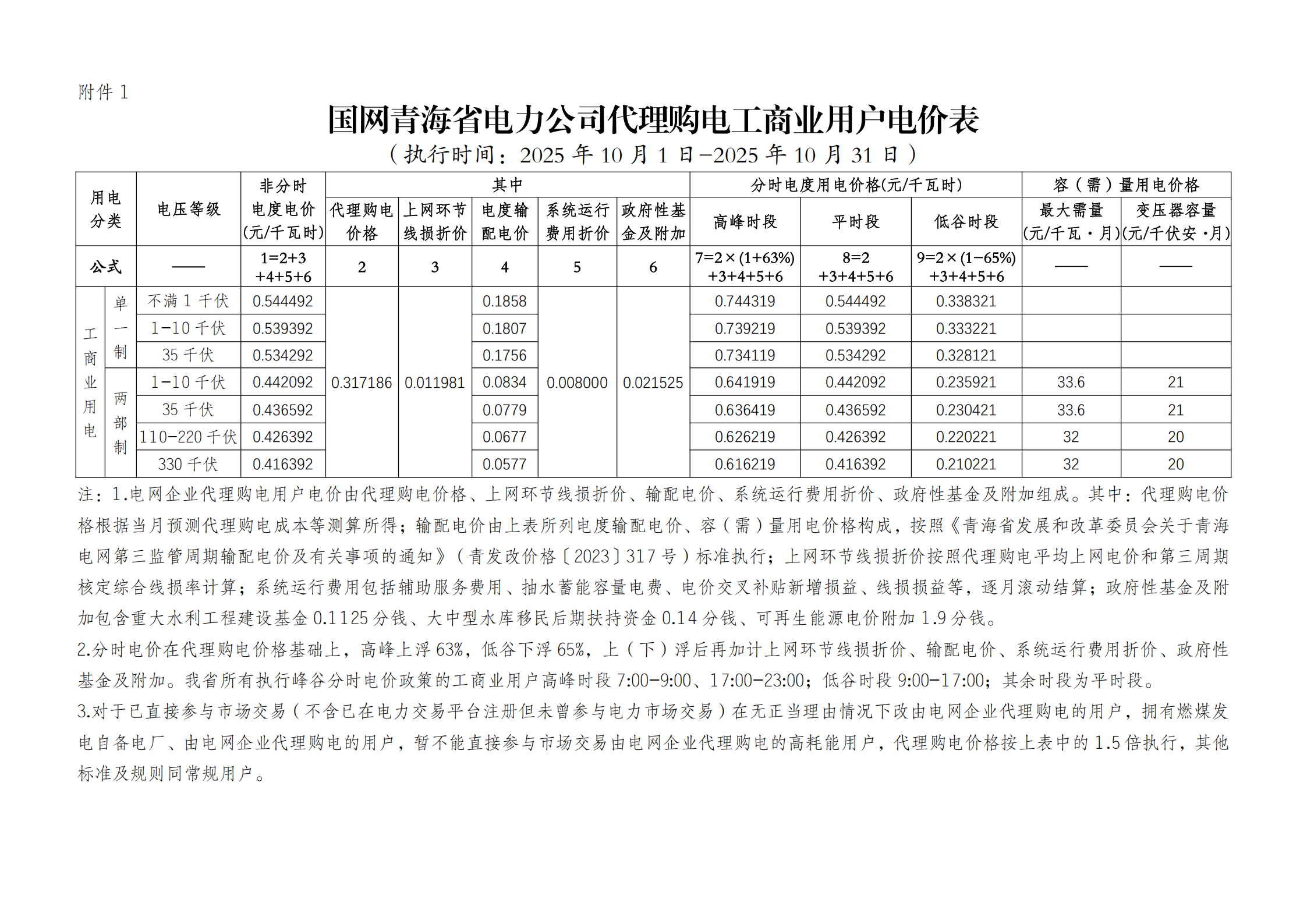 青海省10月份代理購電工商業(yè)用戶電價(jià)表