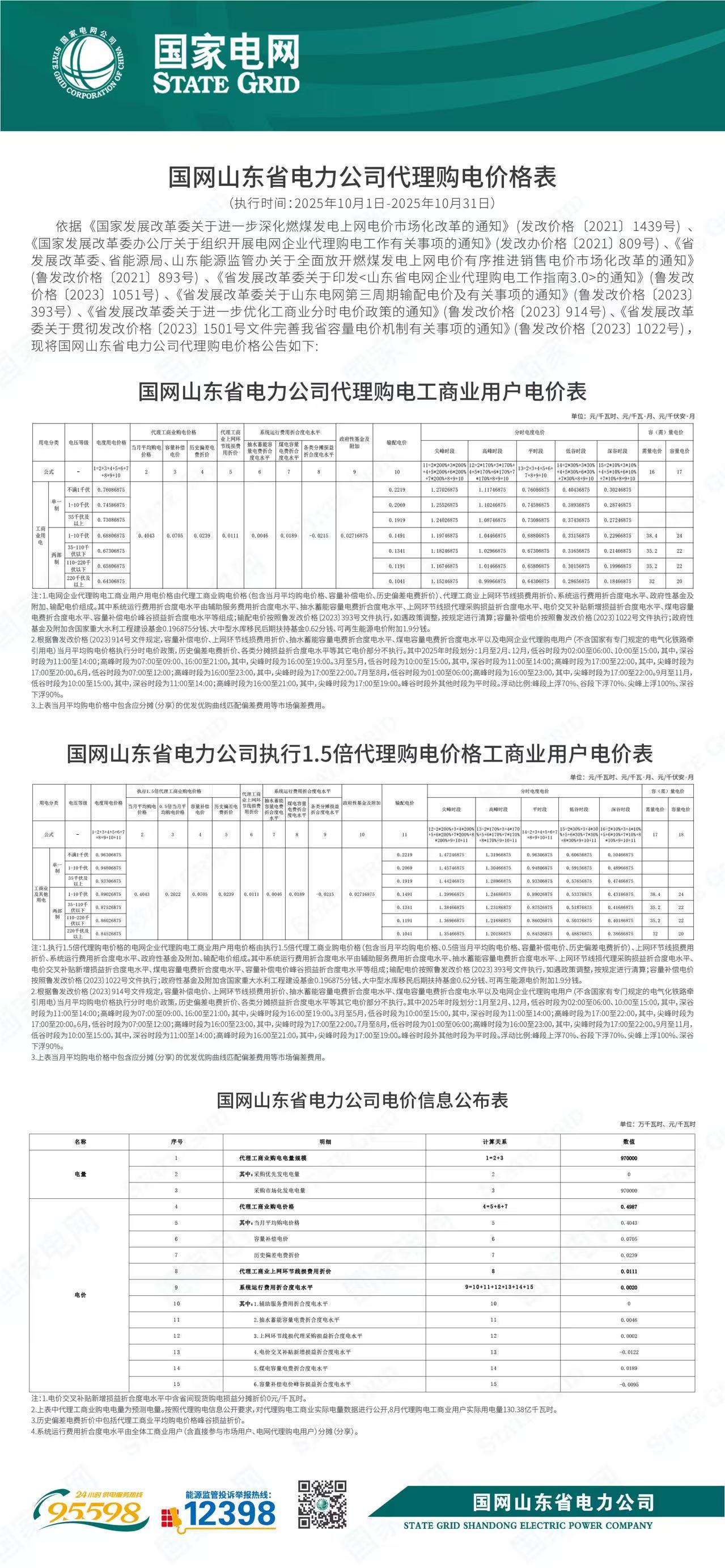 山東省10月份代理購電工商業(yè)用戶電價(jià)表