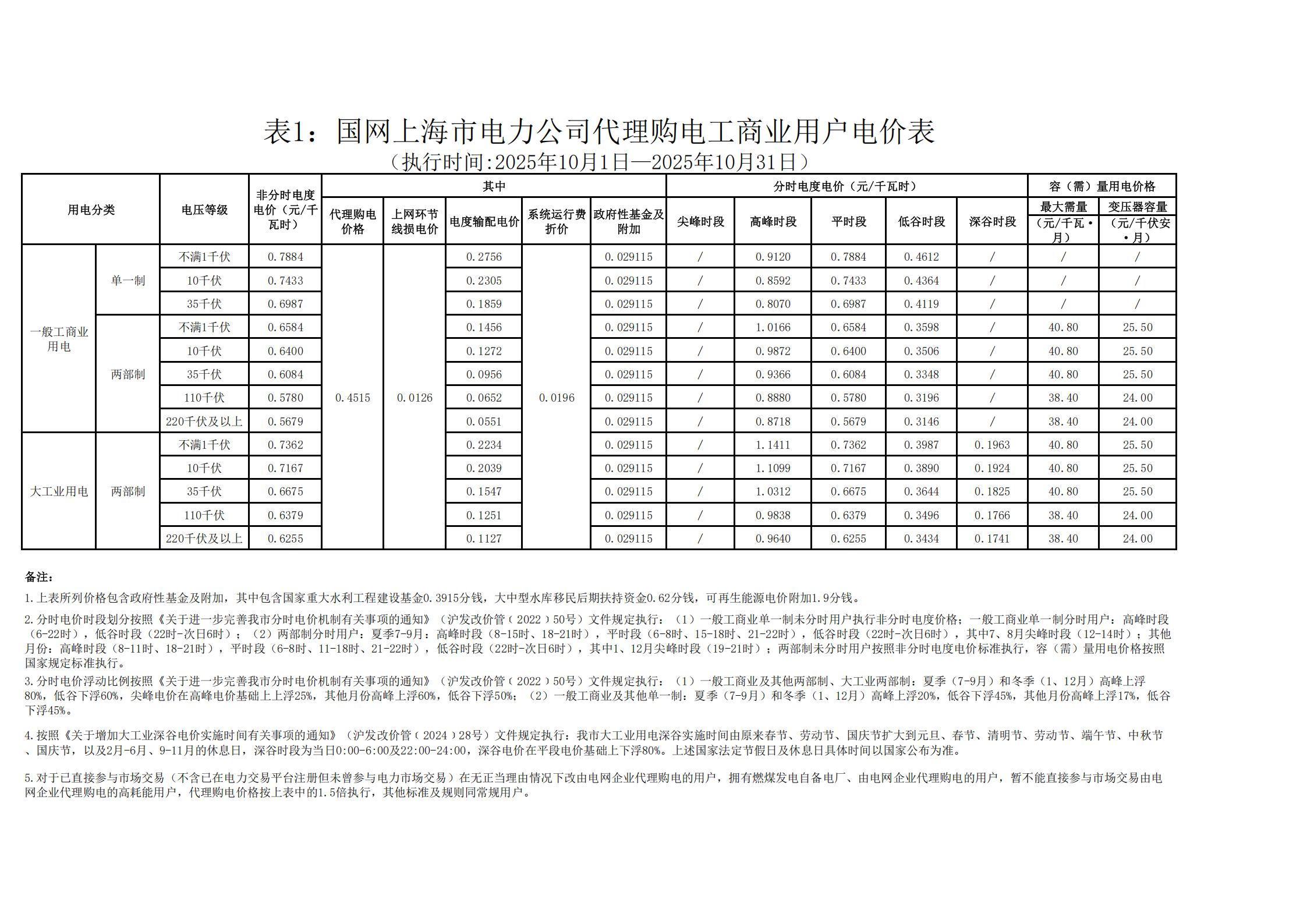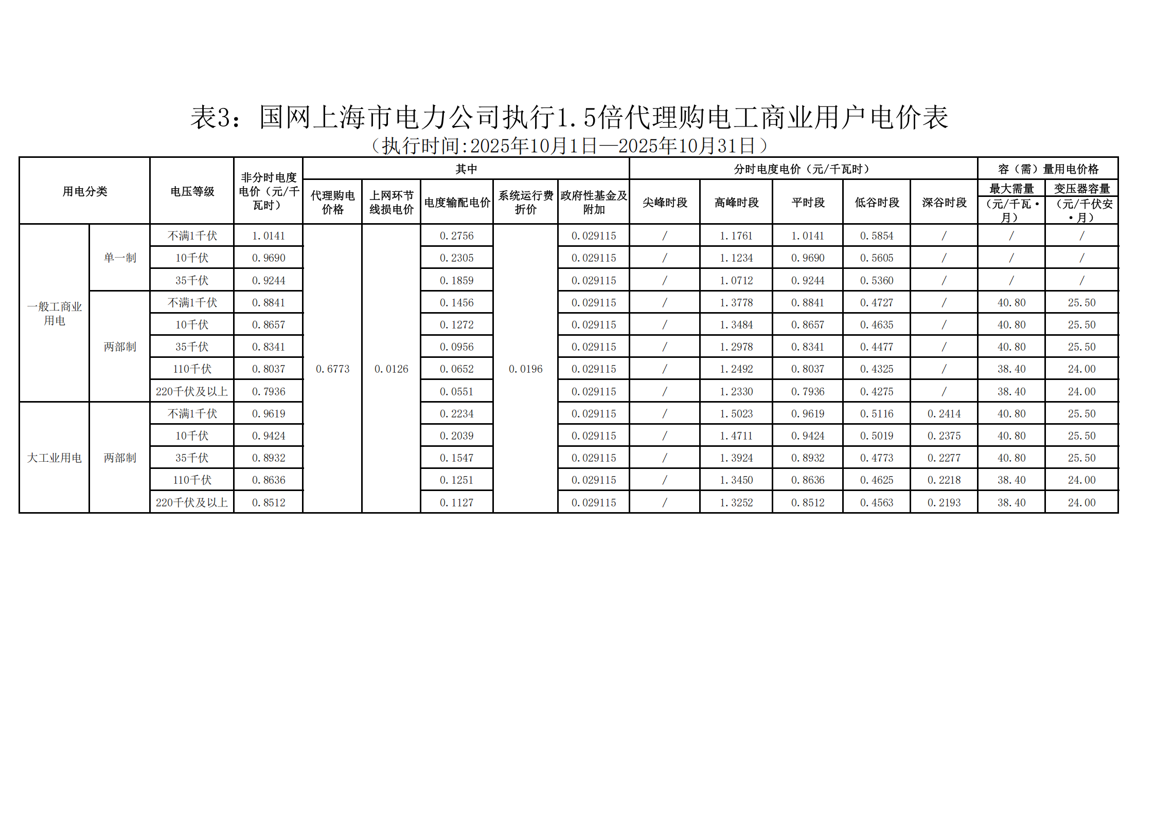 上海10月份代理購電工商業(yè)用戶電價(jià)表