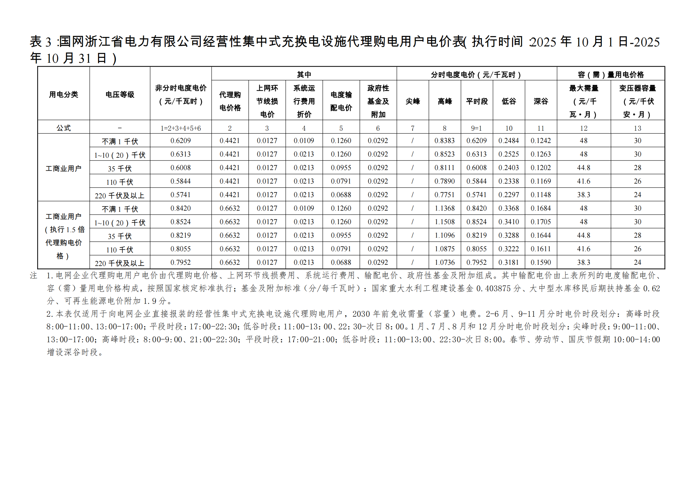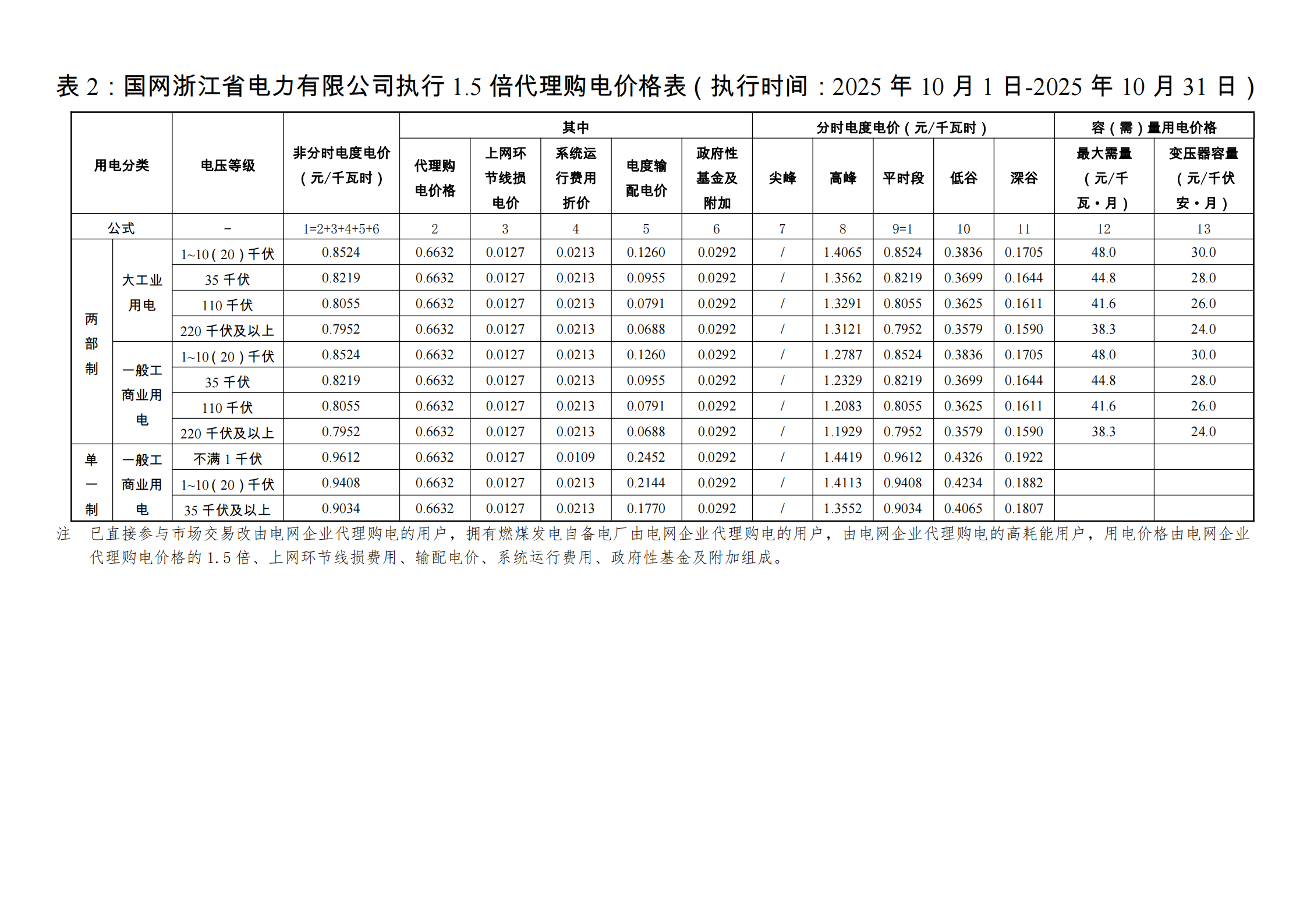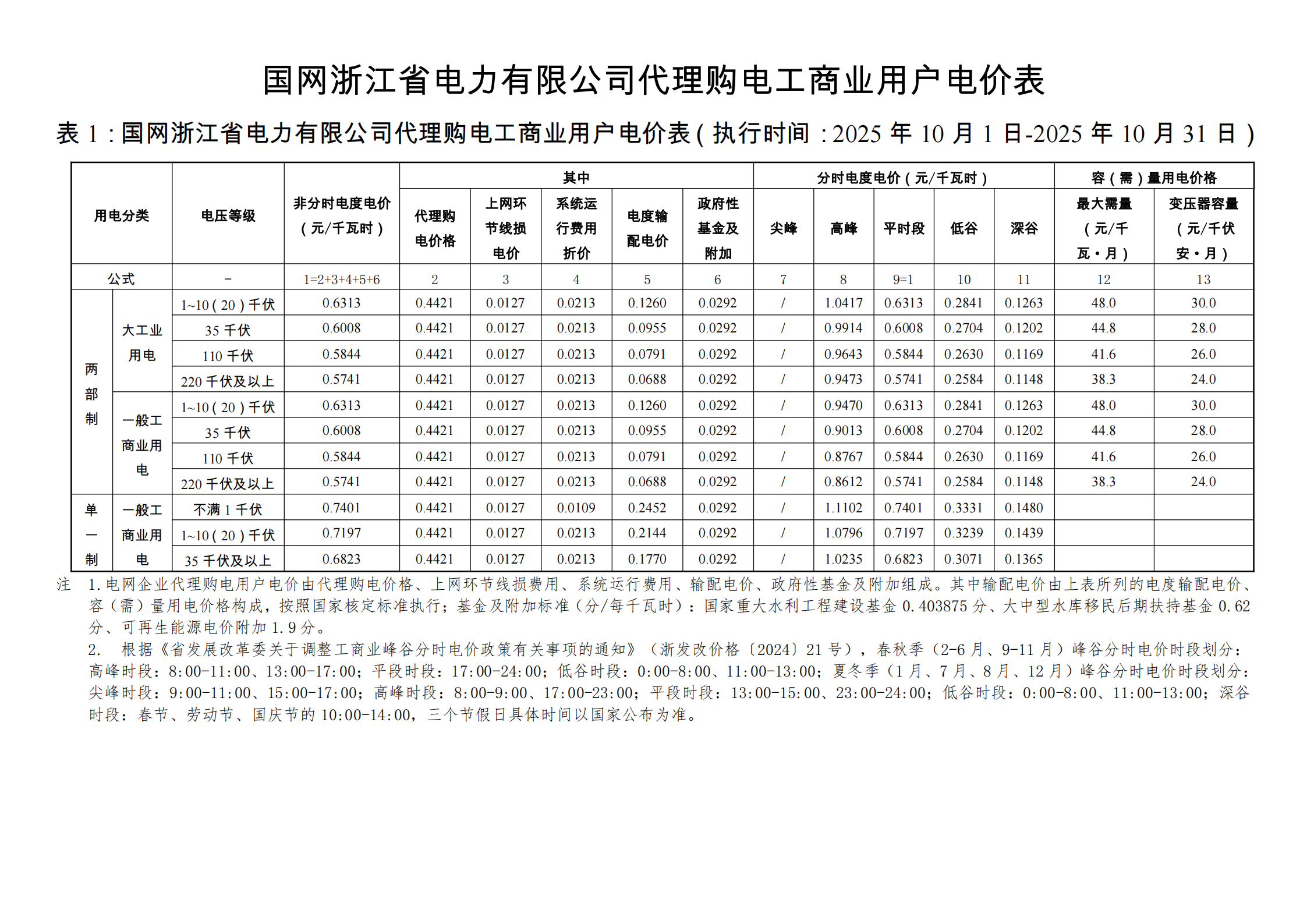 浙江省10月份代理購電工商業(yè)用戶電價(jià)表