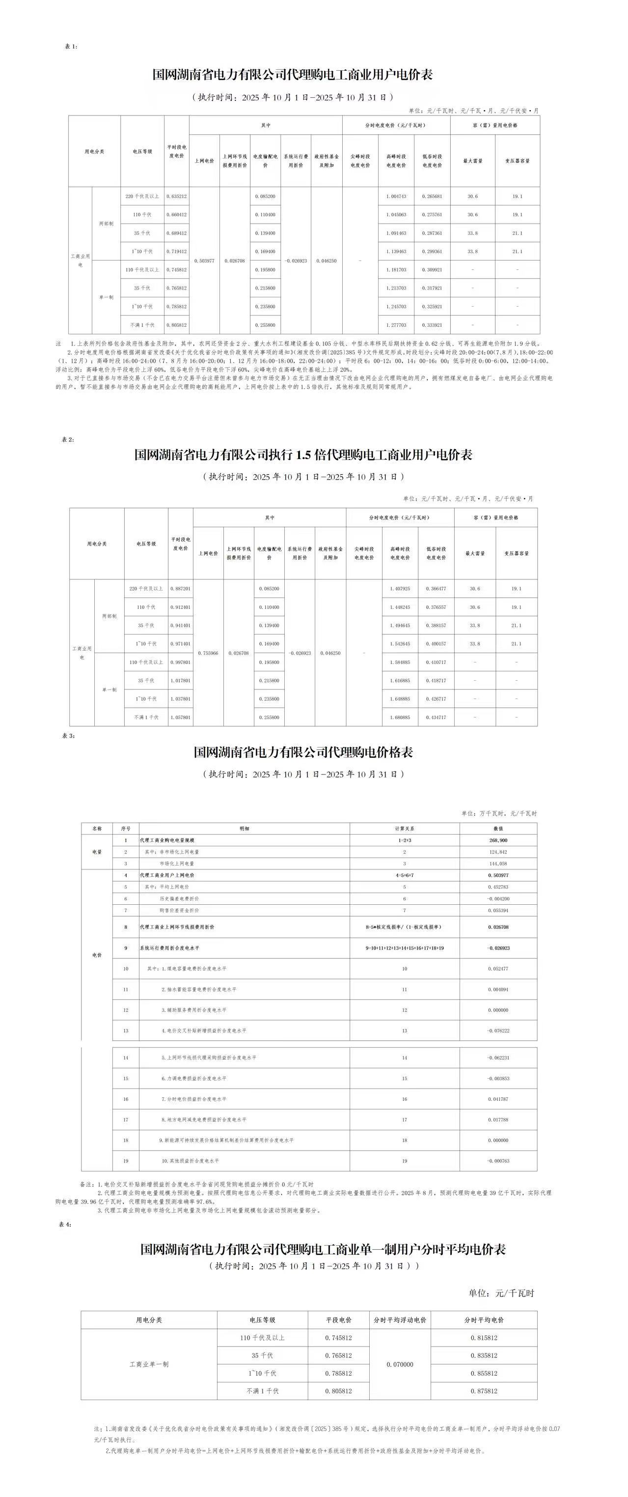 湖南省10月份代理購電工商業(yè)用戶電價(jià)表