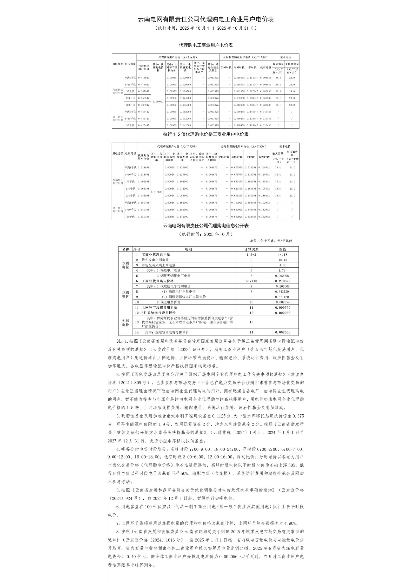 云南省10月份代理購電工商業(yè)用戶電價(jià)表
