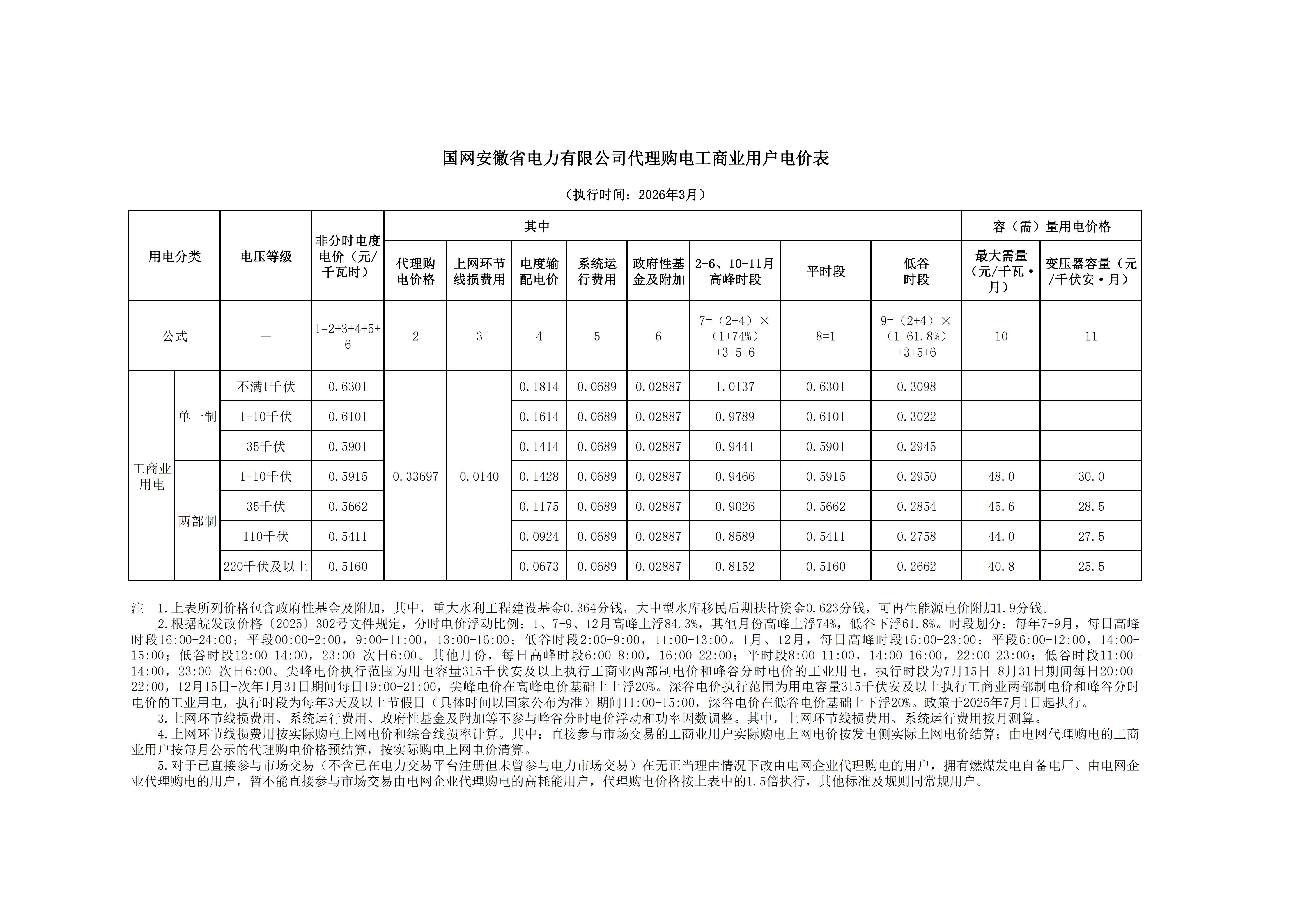 安徽省3月工商業(yè)電價(jià)