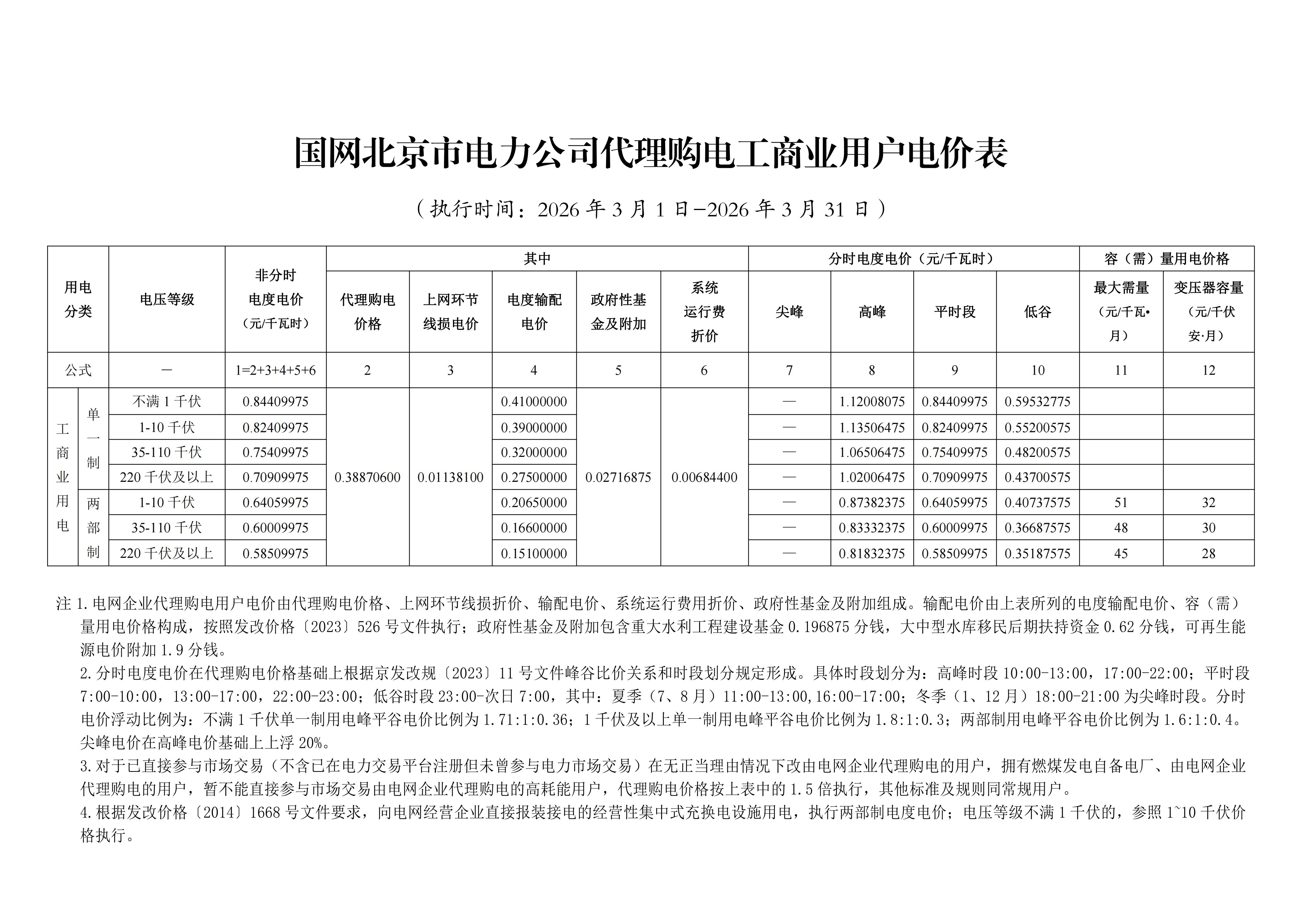 北京3月工商業(yè)電價(jià)