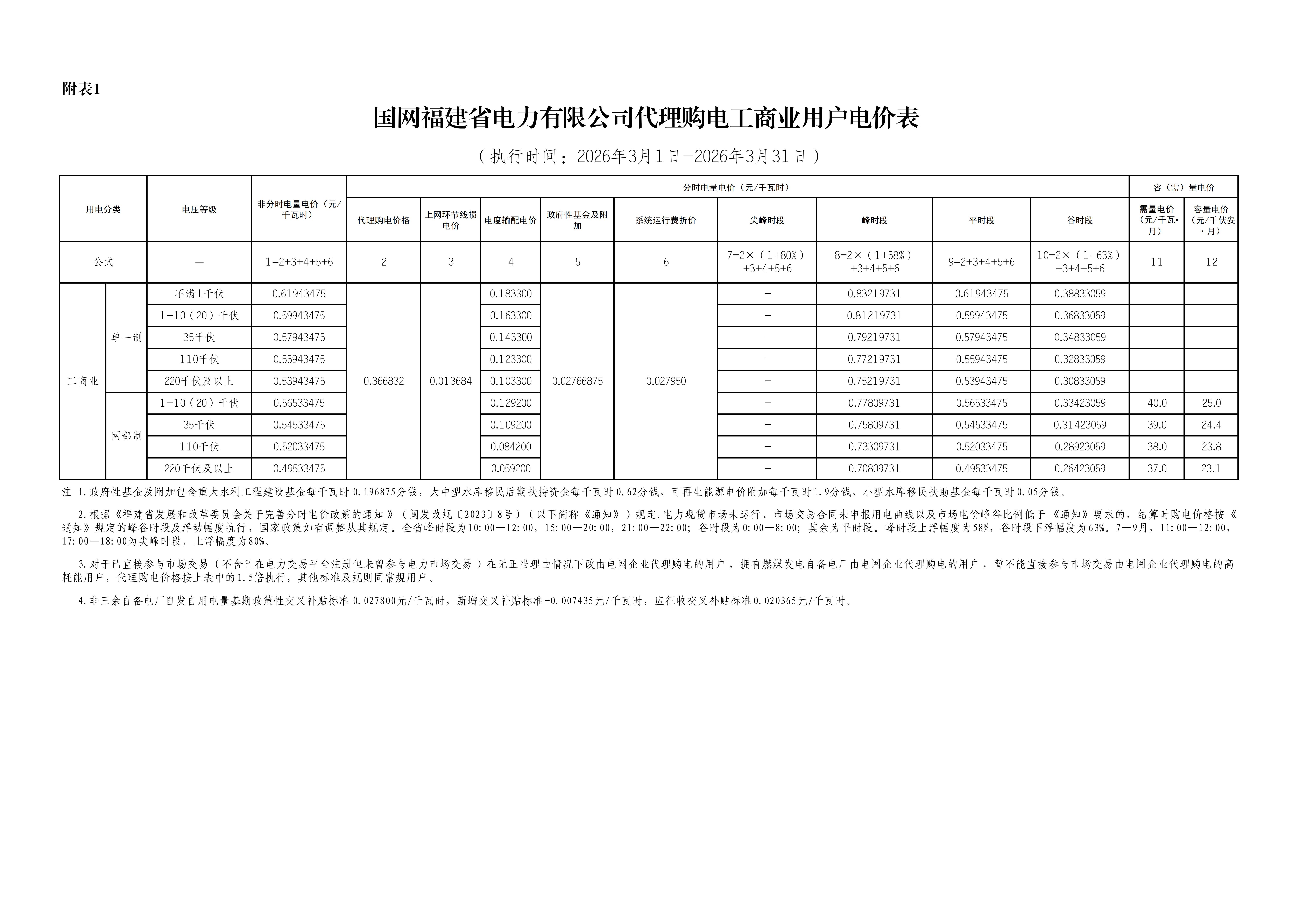 福建省3月工商業(yè)電價(jià)