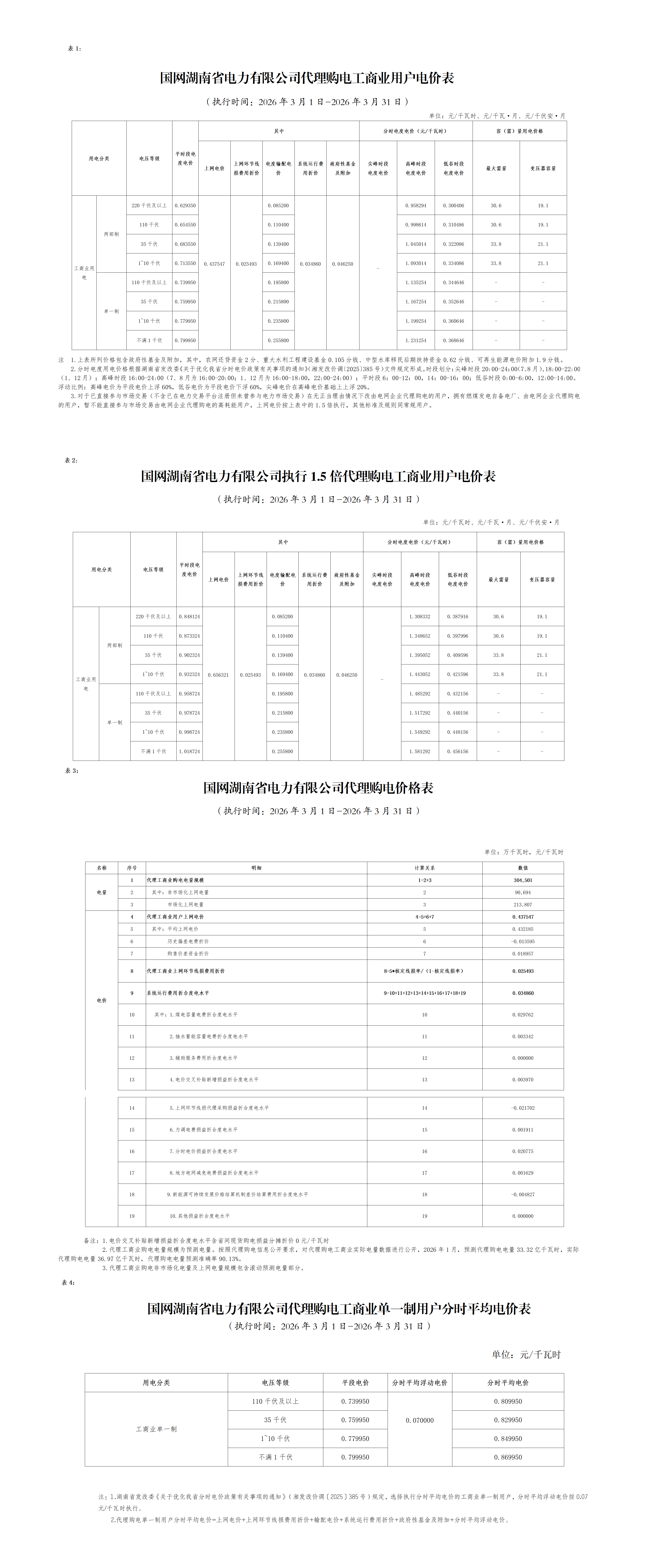 湖南省3月工商業(yè)電價(jià)