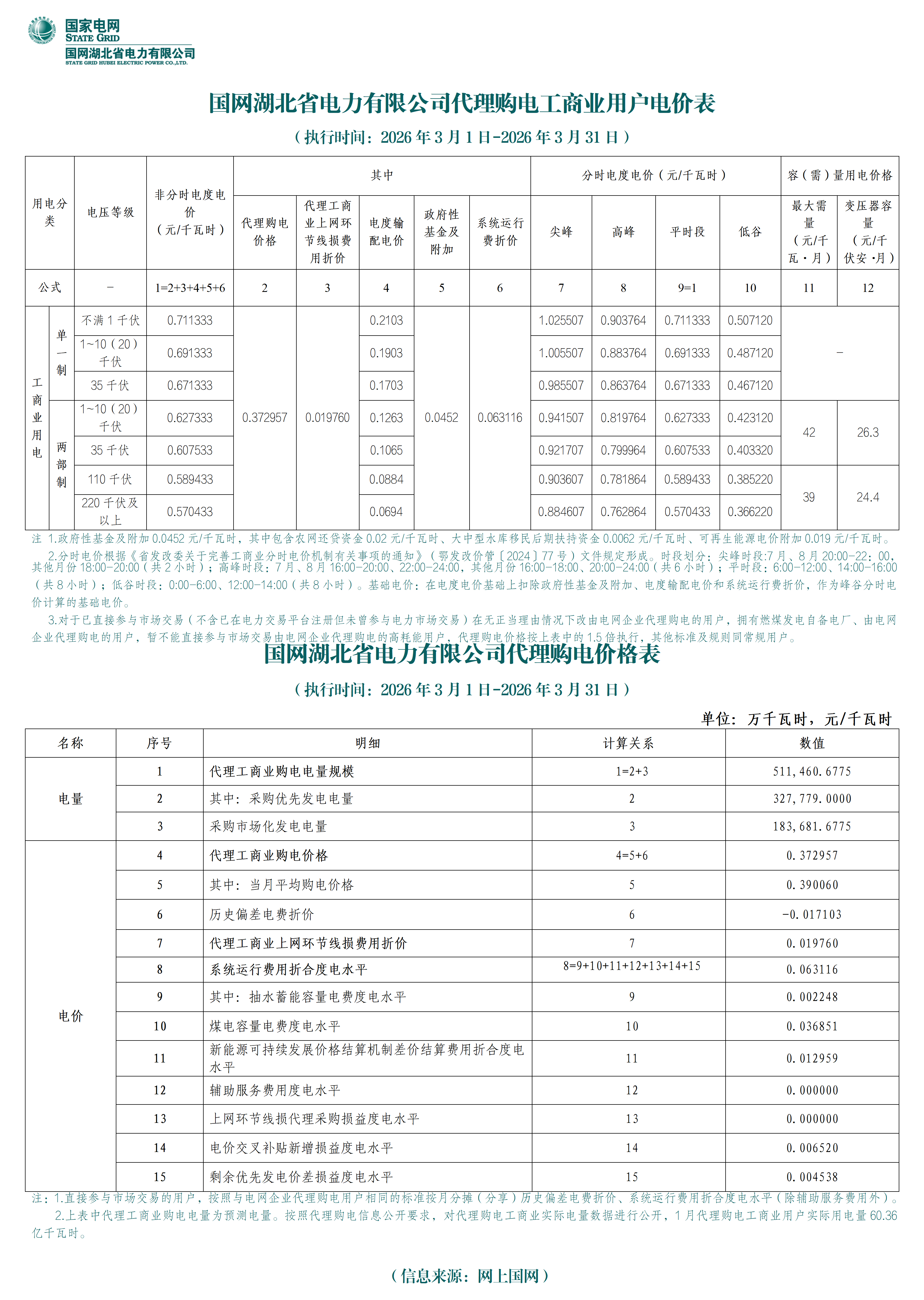 湖北省3月工商業(yè)電價(jià)