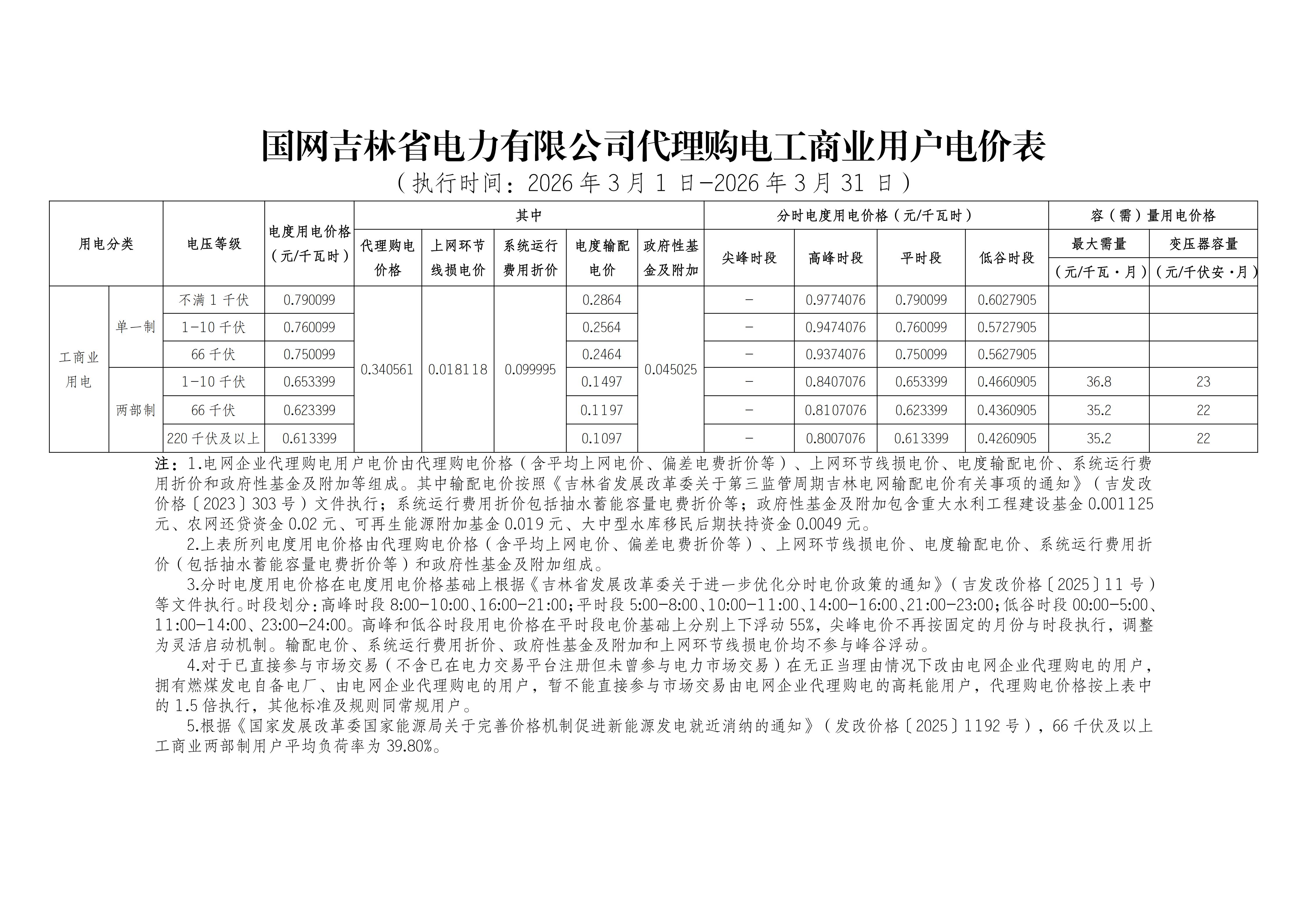 吉林省3月工商業(yè)電價(jià)