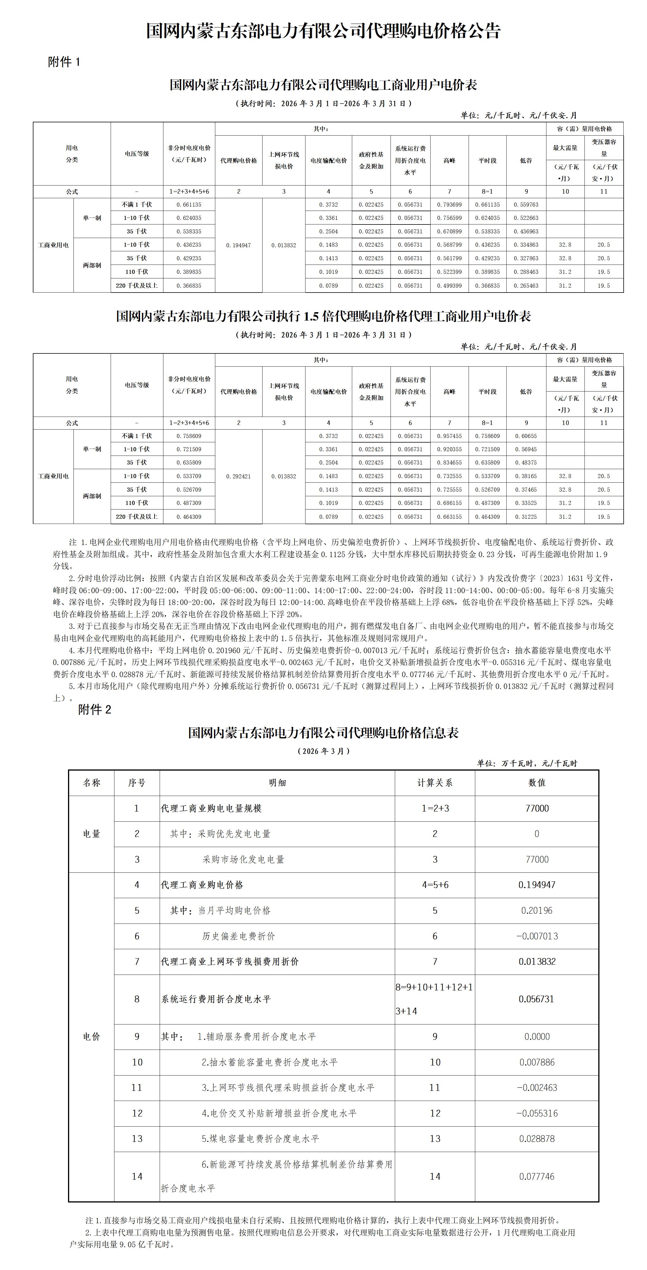 內(nèi)蒙古3月工商業(yè)電價(jià)