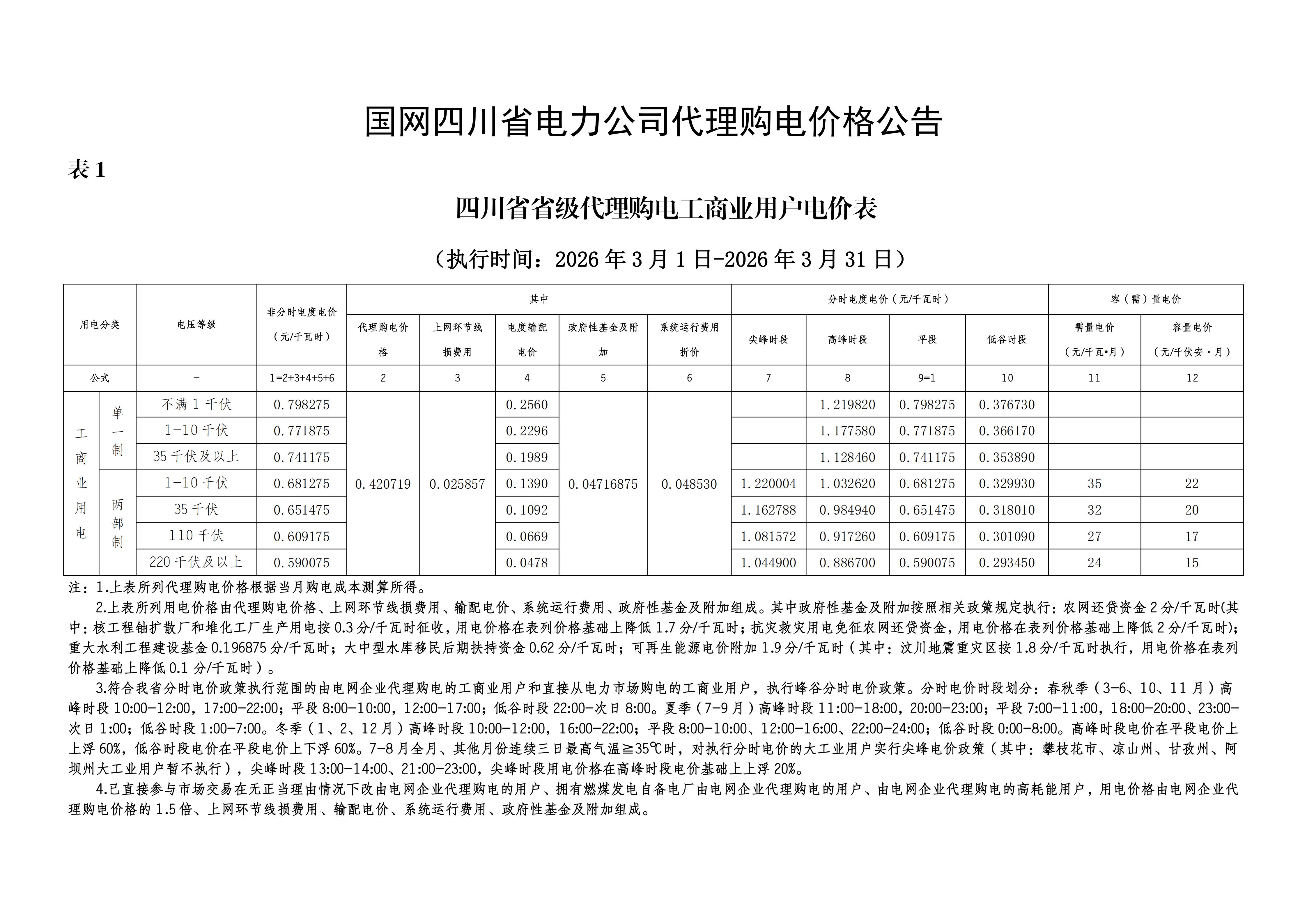 四川省3月工商業(yè)電價(jià)