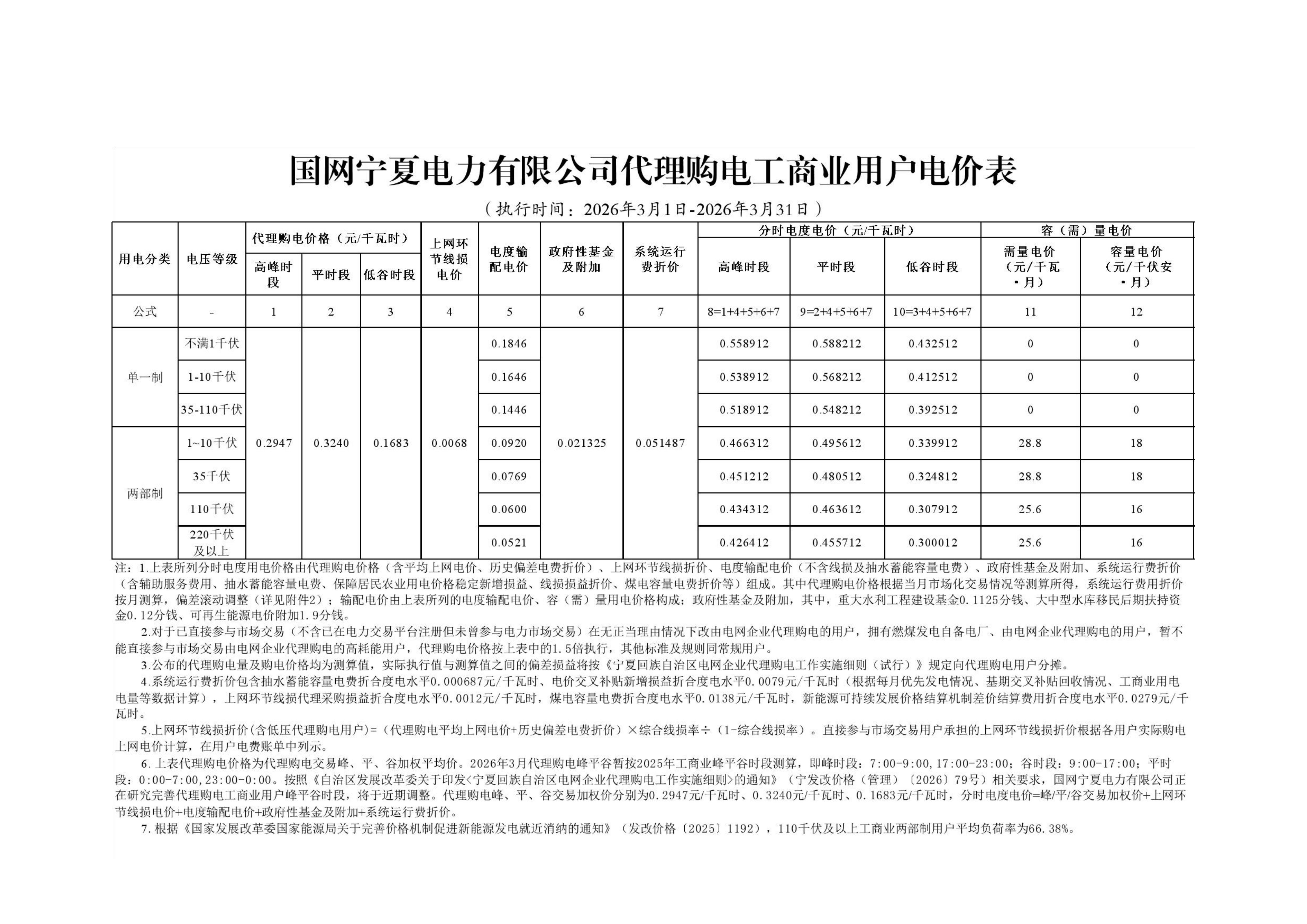 寧夏3月工商業(yè)電價(jià)