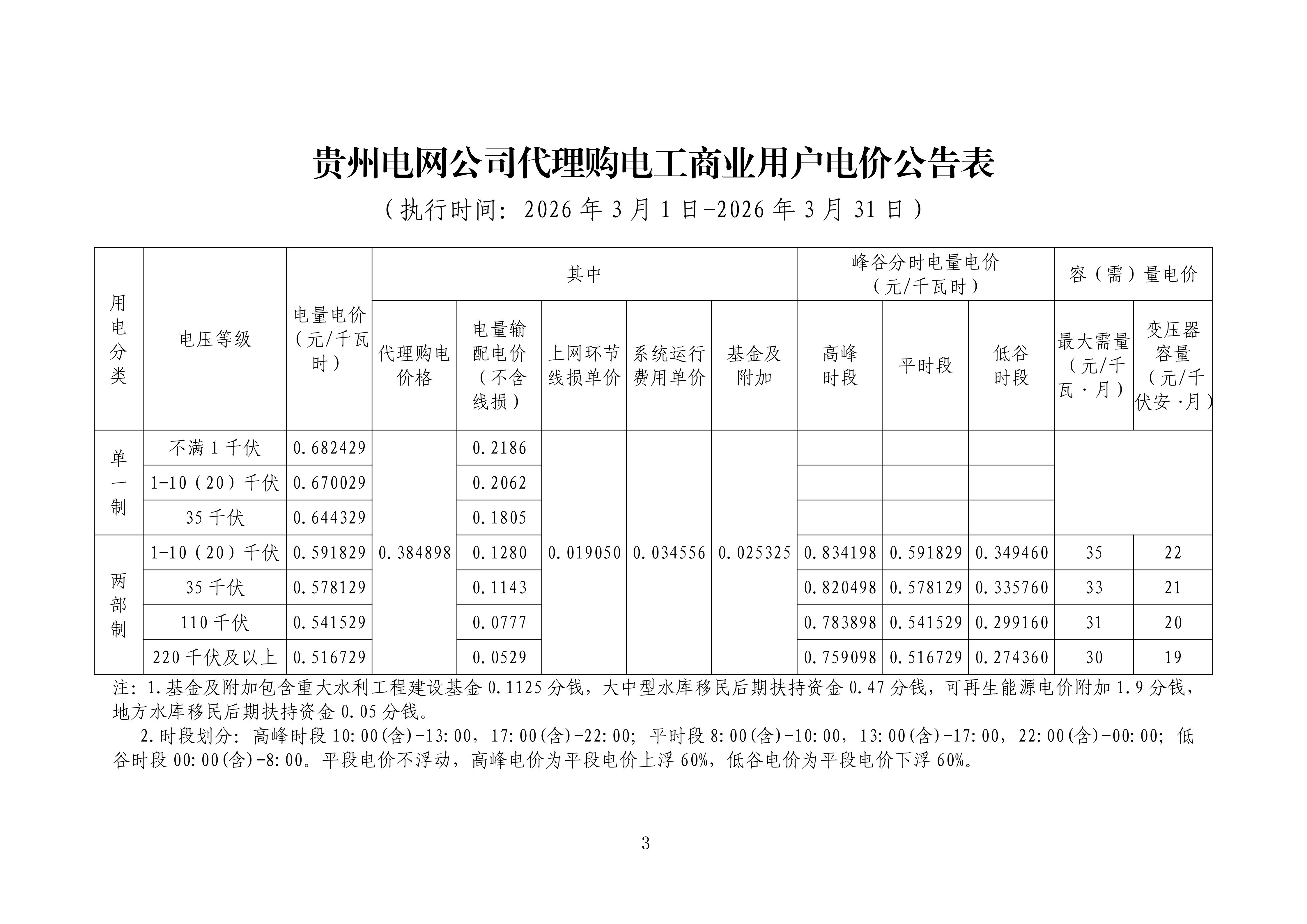 貴州省3月工商業(yè)電價(jià)