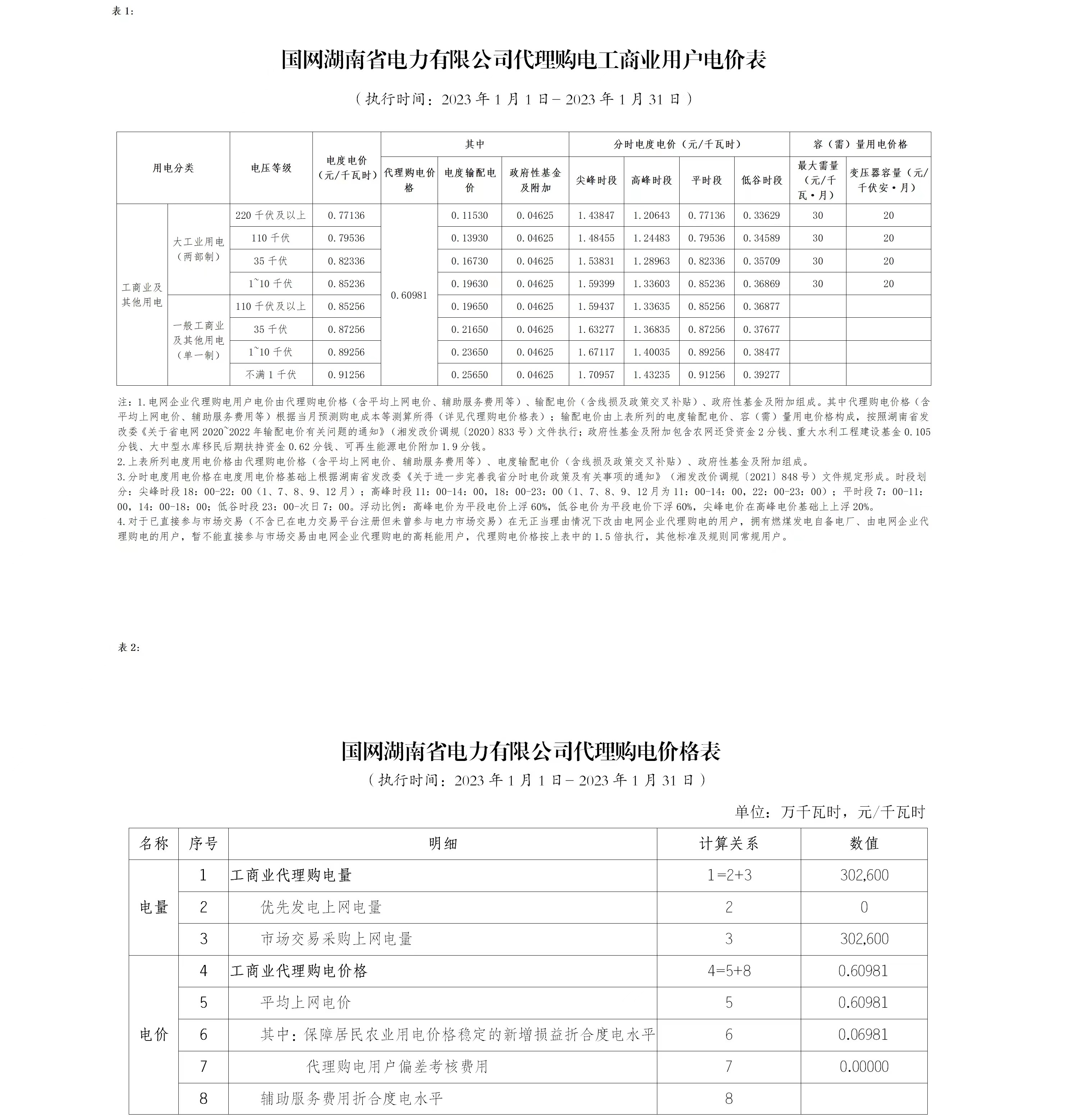 國網(wǎng)湖南省電力有限公司代理購電工商業(yè)用戶分時電價表-2023年1月