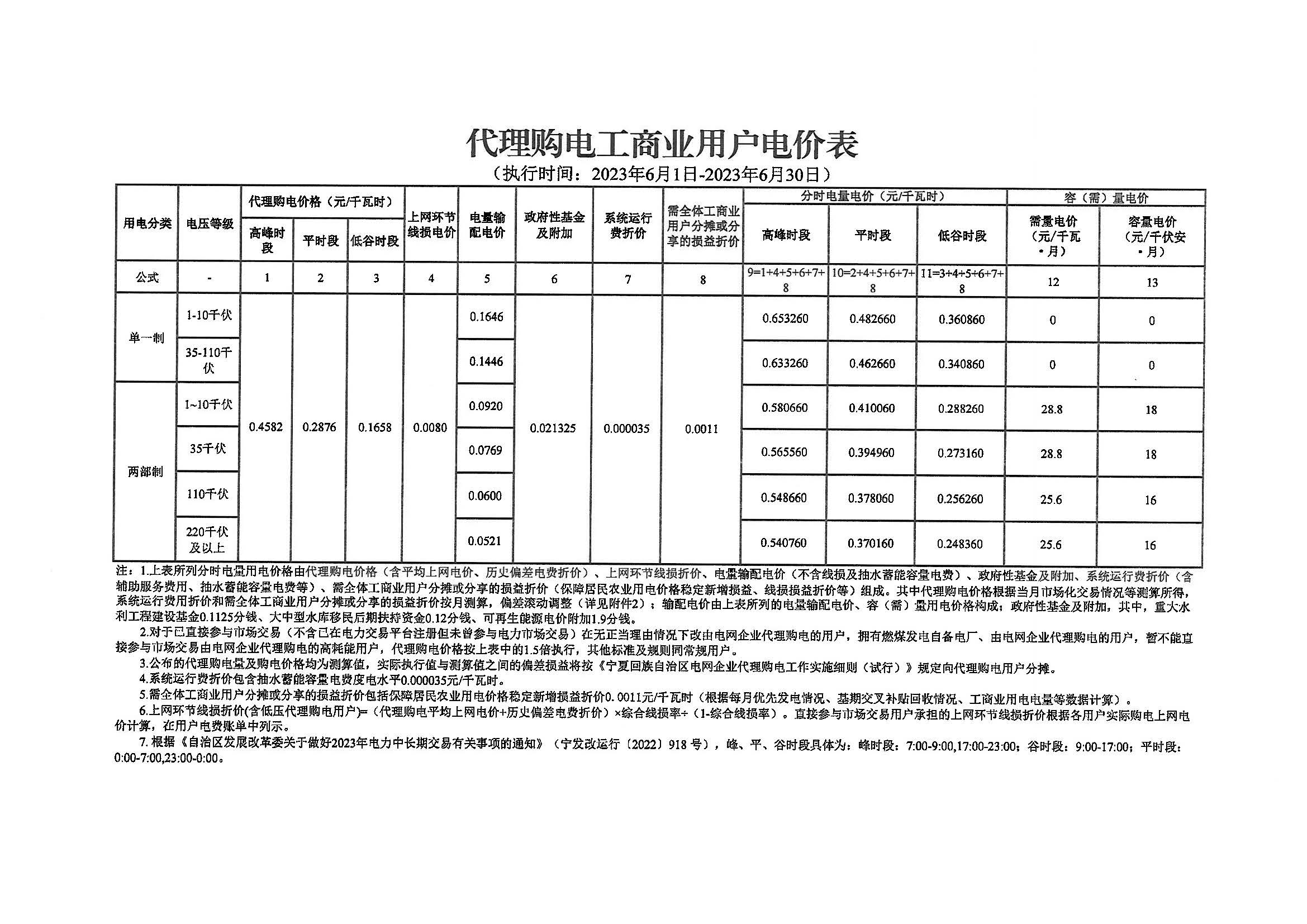 寧夏6月份代理購電工商業(yè)用戶電價表