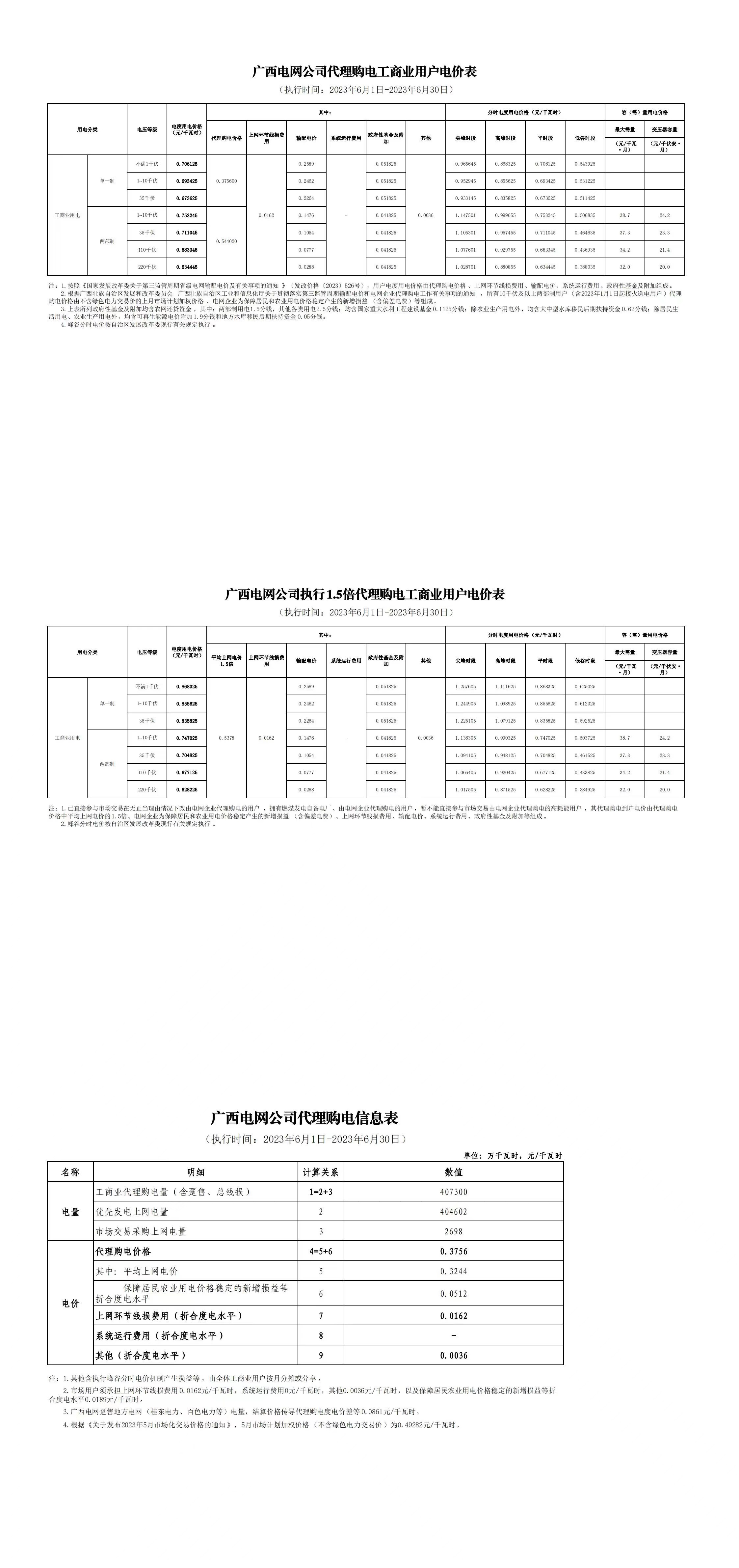 廣西省6月份代理購電工商業(yè)用戶電價(jià)表