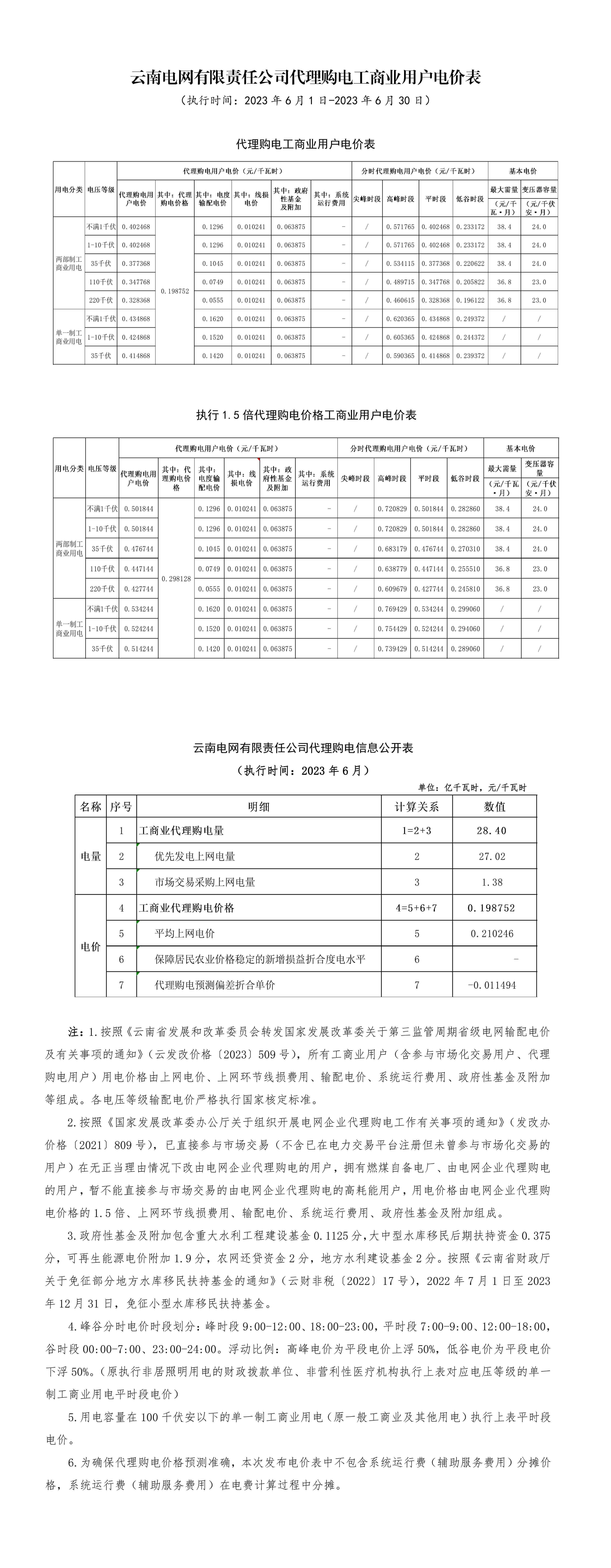 云南省6月份代理購電工商業(yè)用戶電價(jià)表
