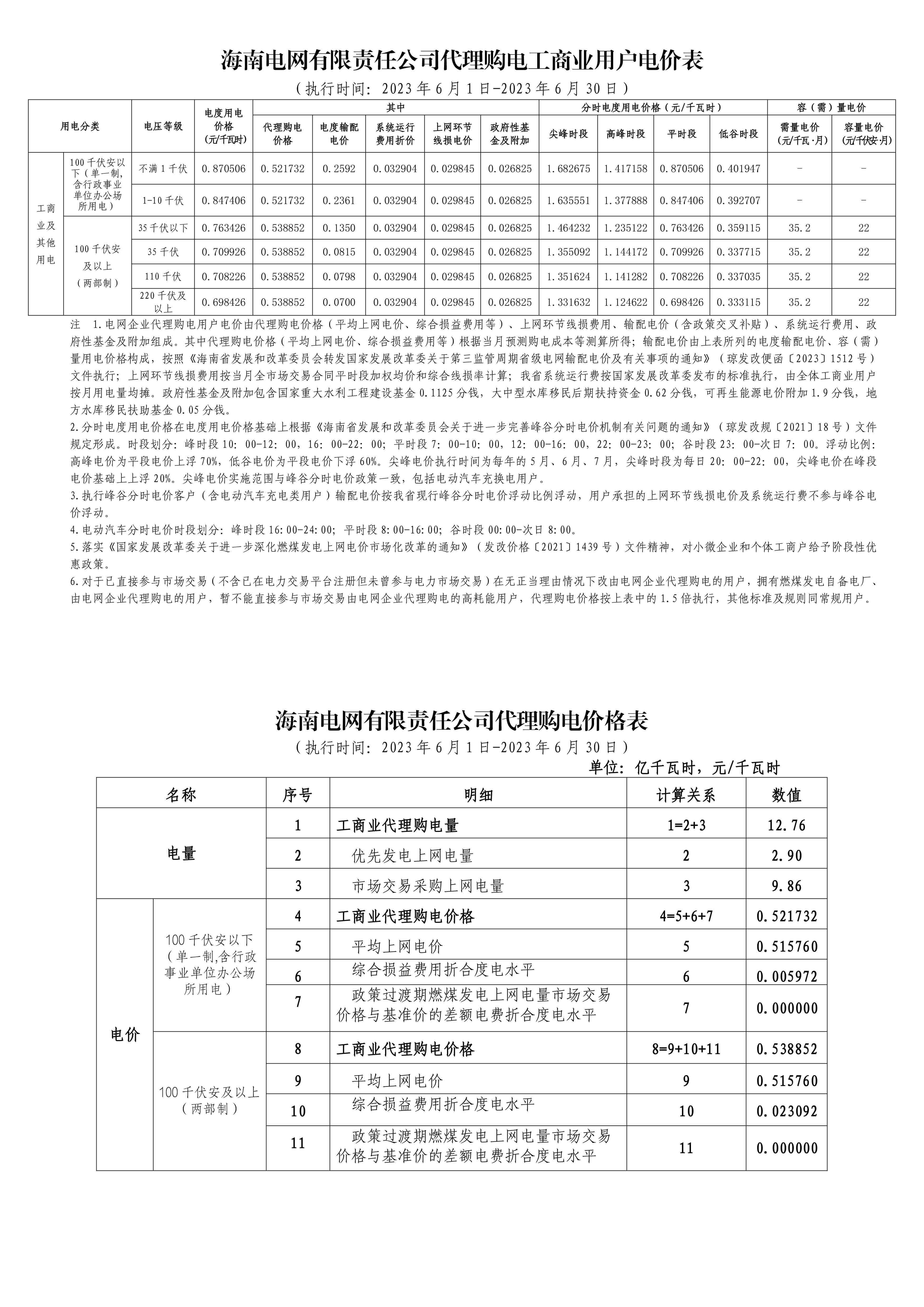 海南省6月份代理購電工商業(yè)用戶電價(jià)表