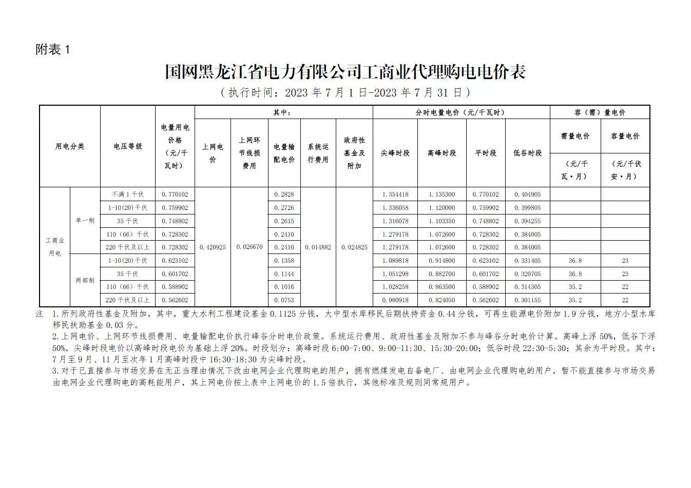 黑龍江省7月份代理購(gòu)電工商業(yè)用戶電價(jià)表