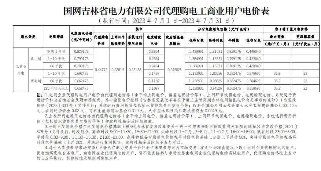 吉林省7月份代理購(gòu)電工商業(yè)用戶電價(jià)表