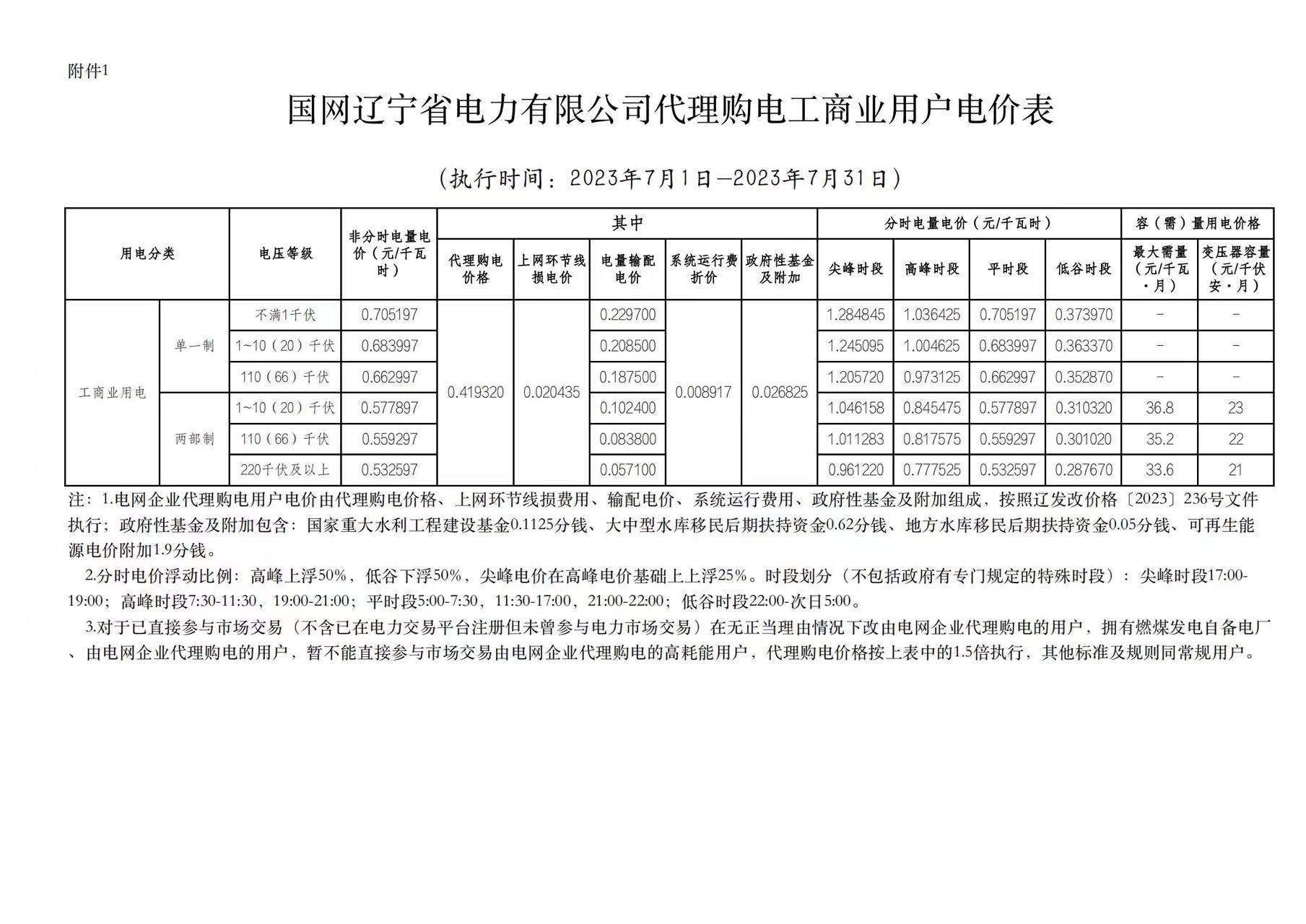 遼寧省7月份代理購(gòu)電工商業(yè)用戶電價(jià)表
