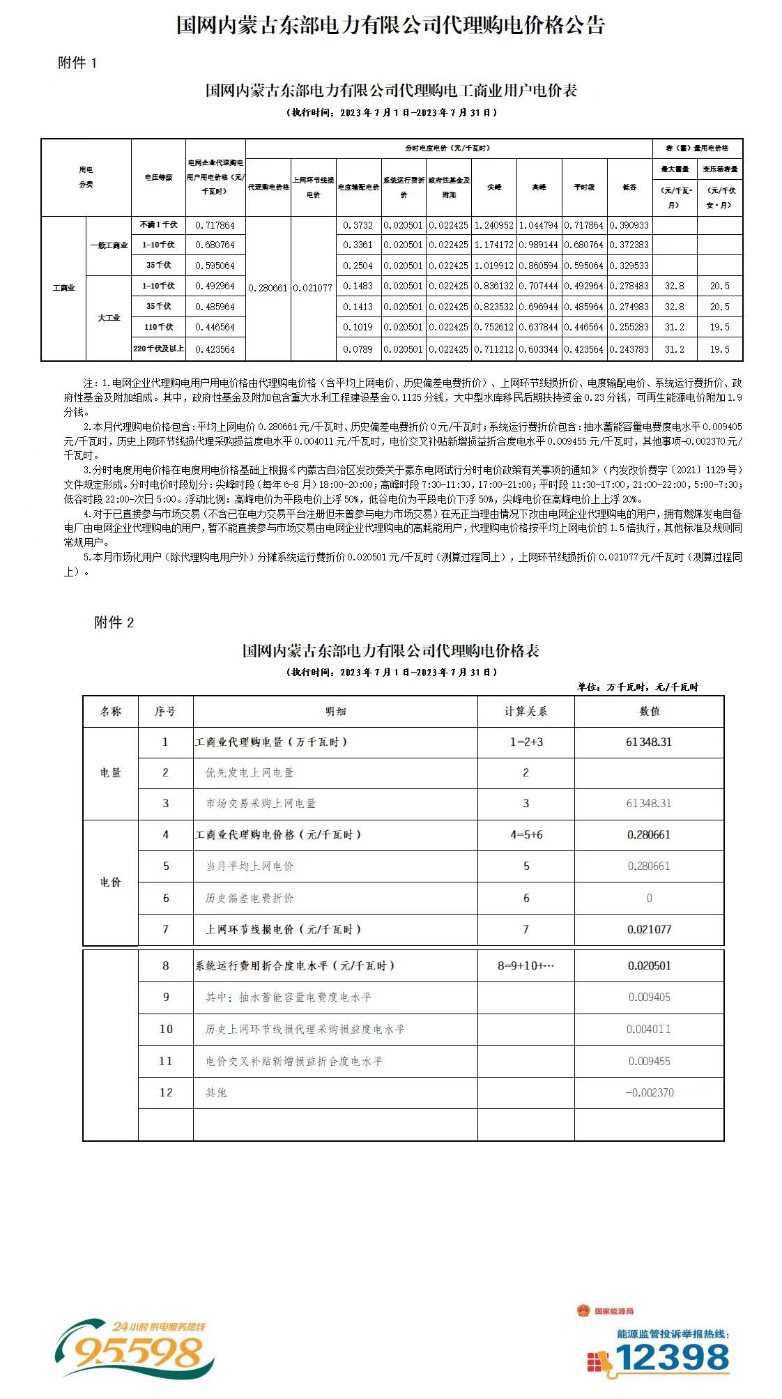內(nèi)蒙古(蒙東)7月份代理購(gòu)電工商業(yè)用戶電價(jià)表