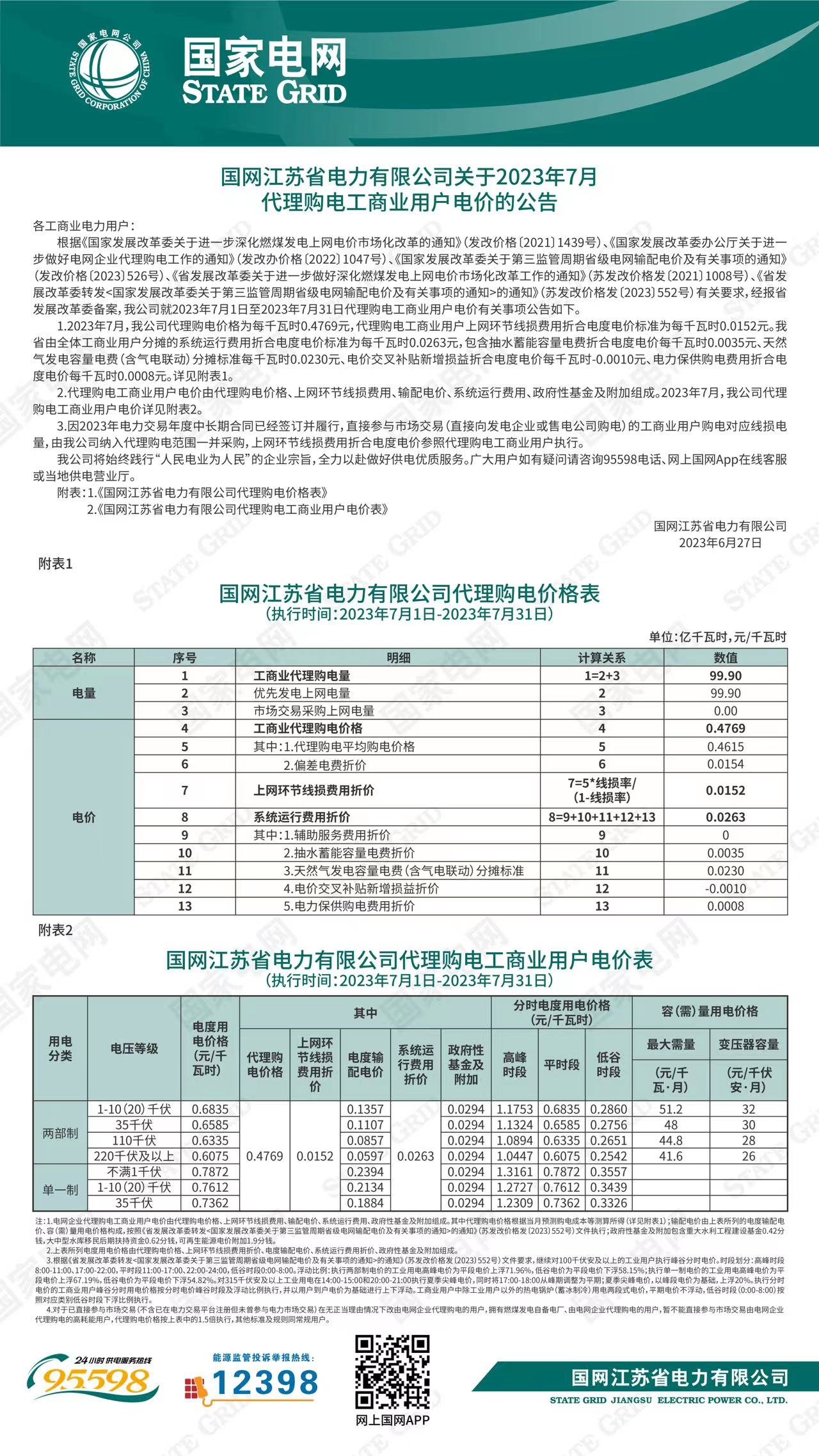 江蘇省7月份代理購電工商業(yè)用戶電價表