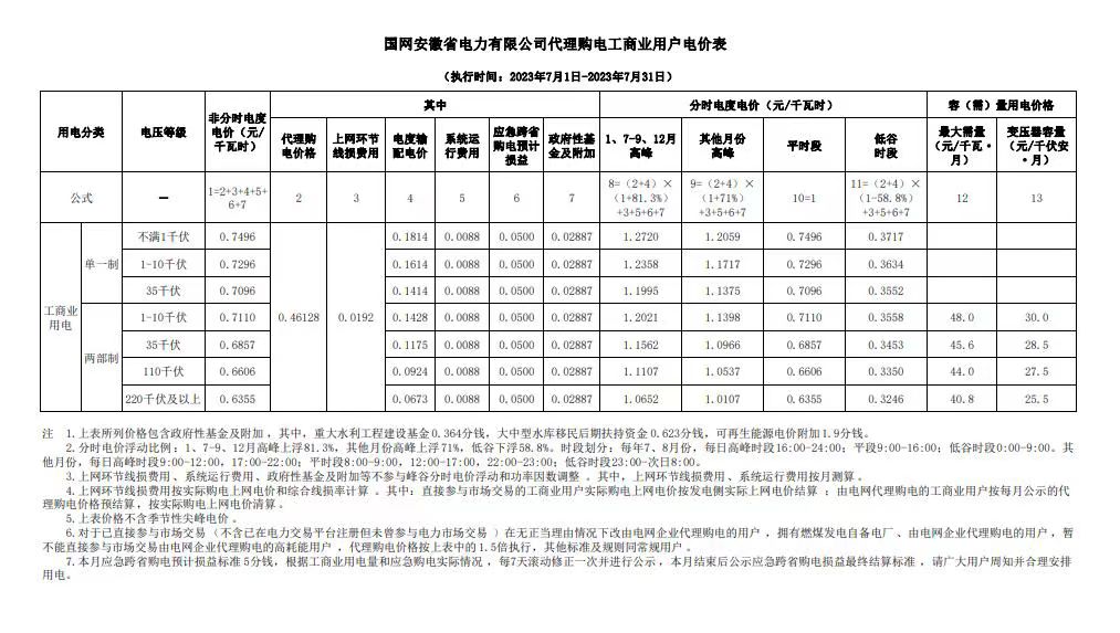 安徽省7月份代理購電工商業(yè)用戶電價表