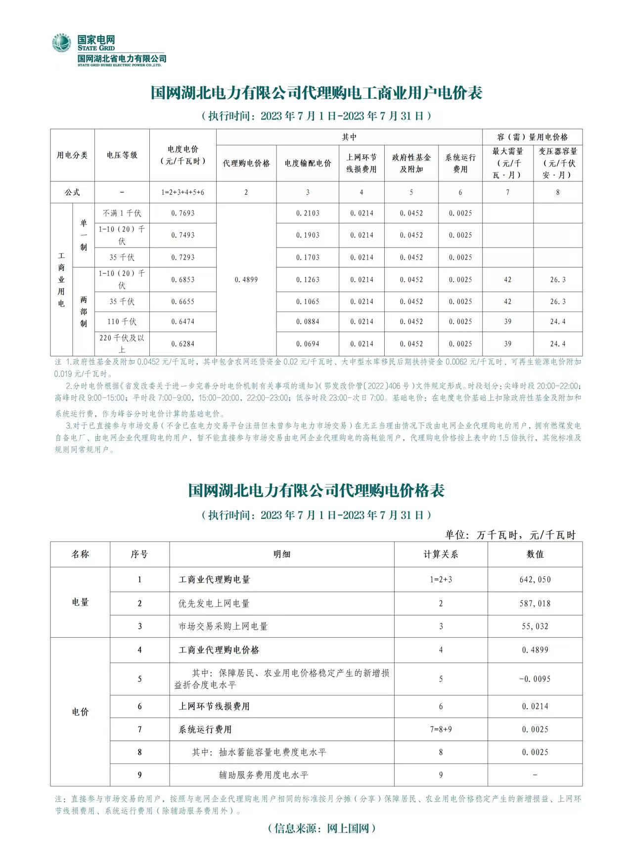 湖北省7月份代理購電工商業(yè)用戶電價表