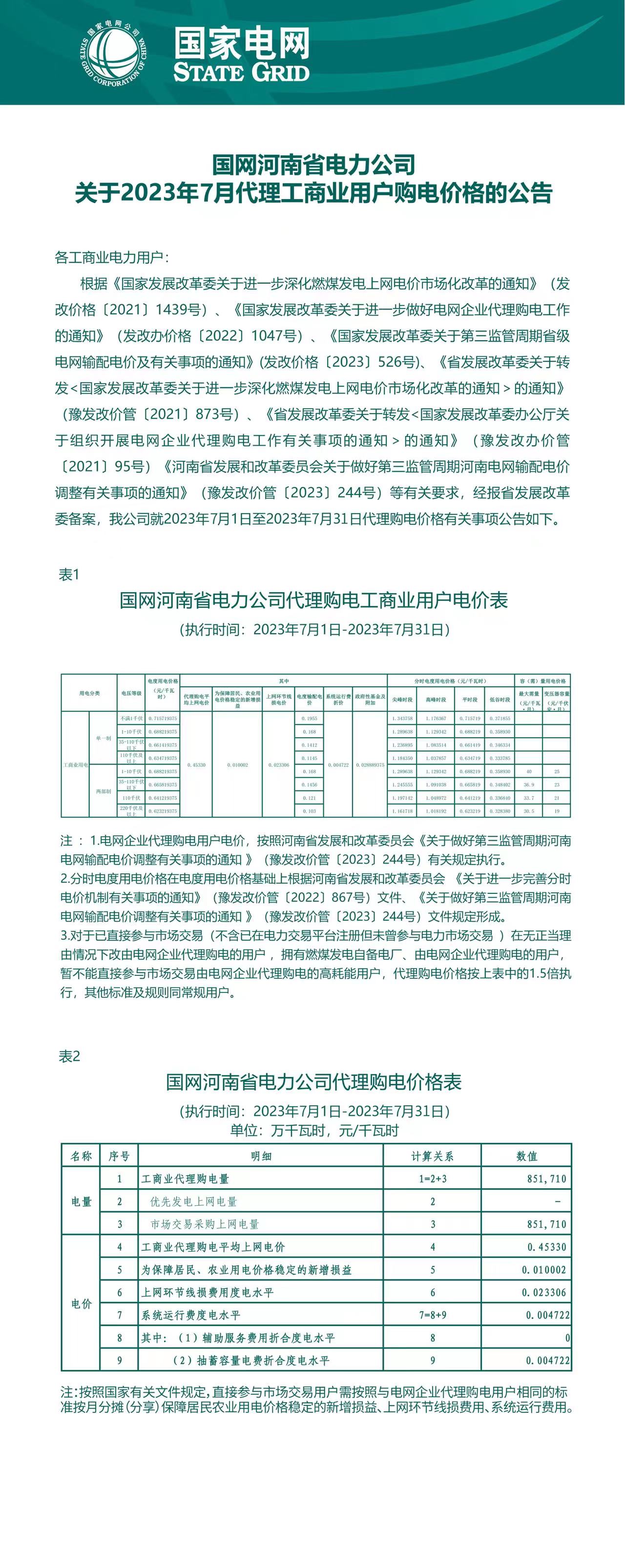 河南省7月份代理購電工商業(yè)用戶電價表