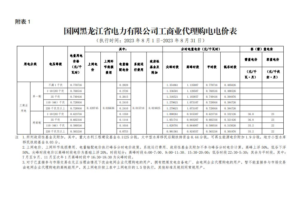 黑龍江省8月份代理購電工商業(yè)用戶電價(jià)表