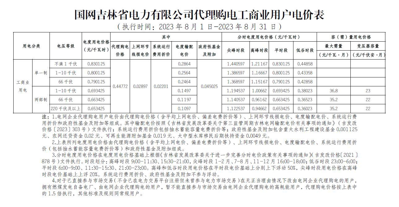吉林省8月份代理購電工商業(yè)用戶電價(jià)表